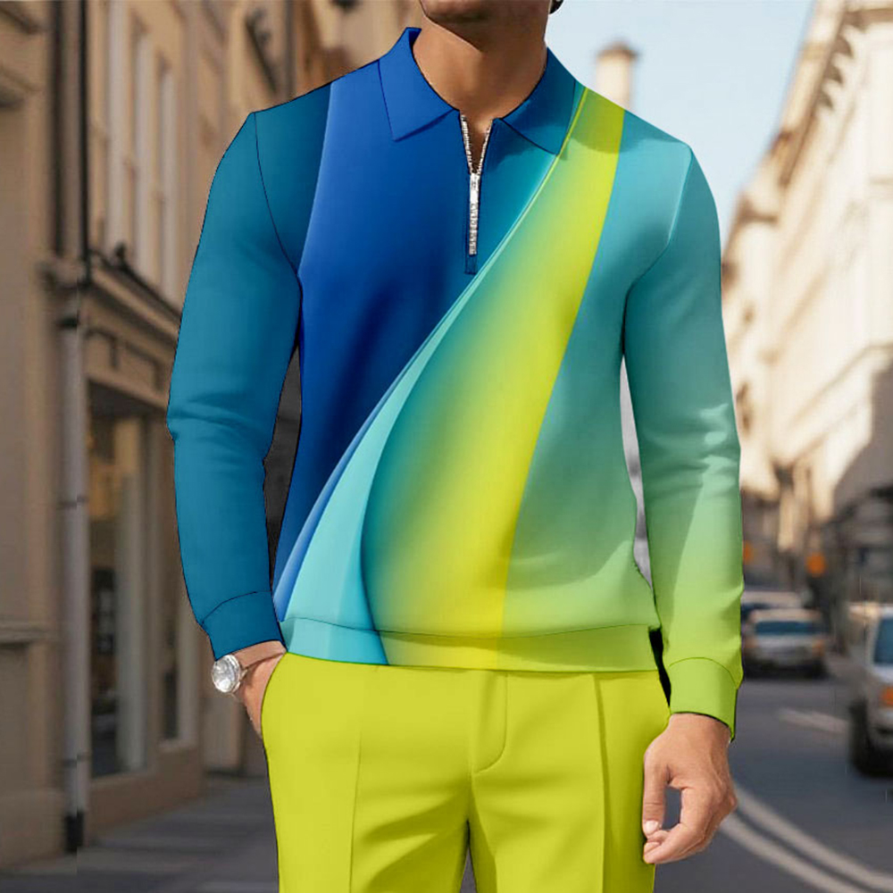 Men's Casual Green Gradient Color Matching Printed Polo-Collar Zipper Long Sleeved Trousers Two-Piece Set