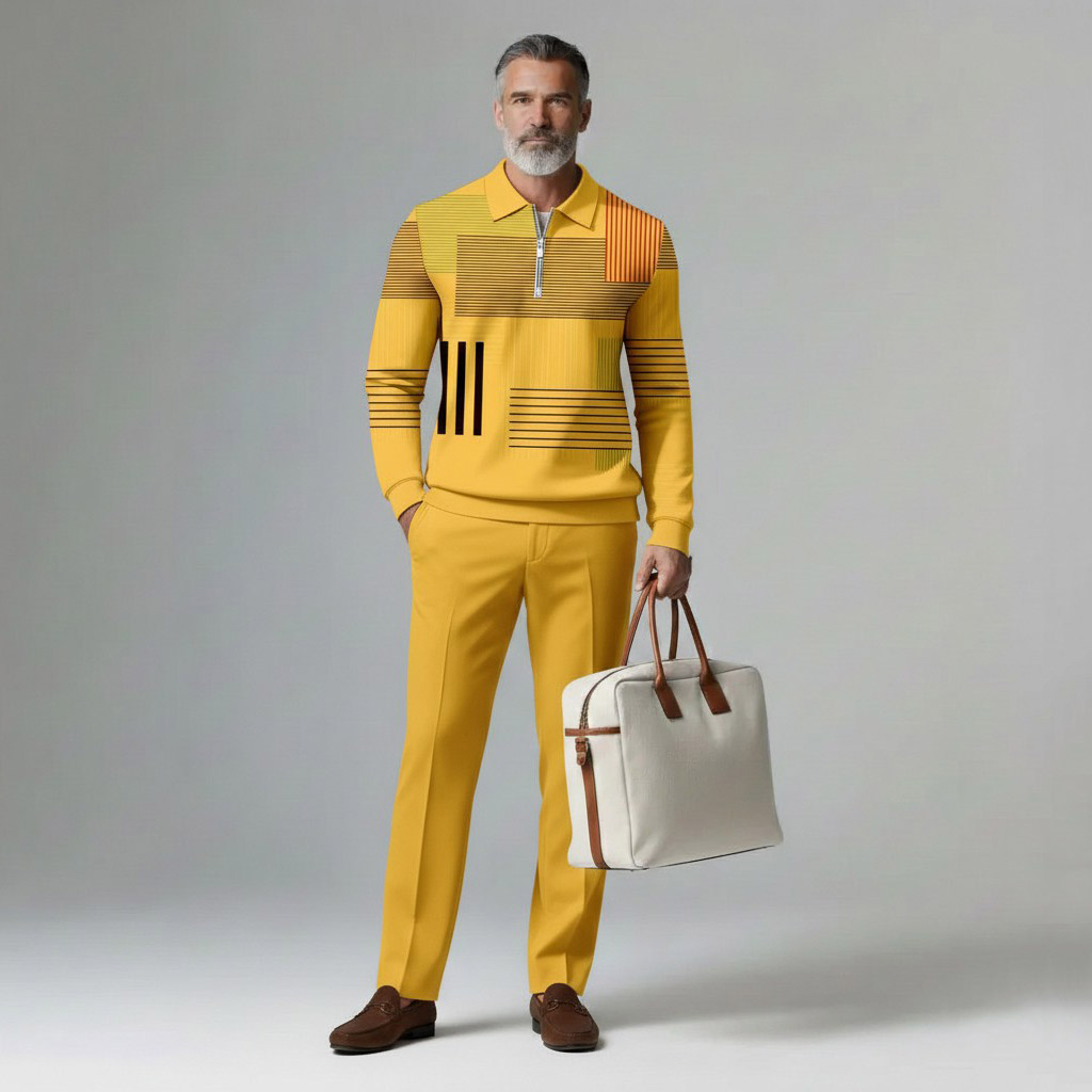 Men's Casual Yellow Color Matching Striped Printed Polo-Collar Zipper Long Sleeved Trousers Two-Piece Set