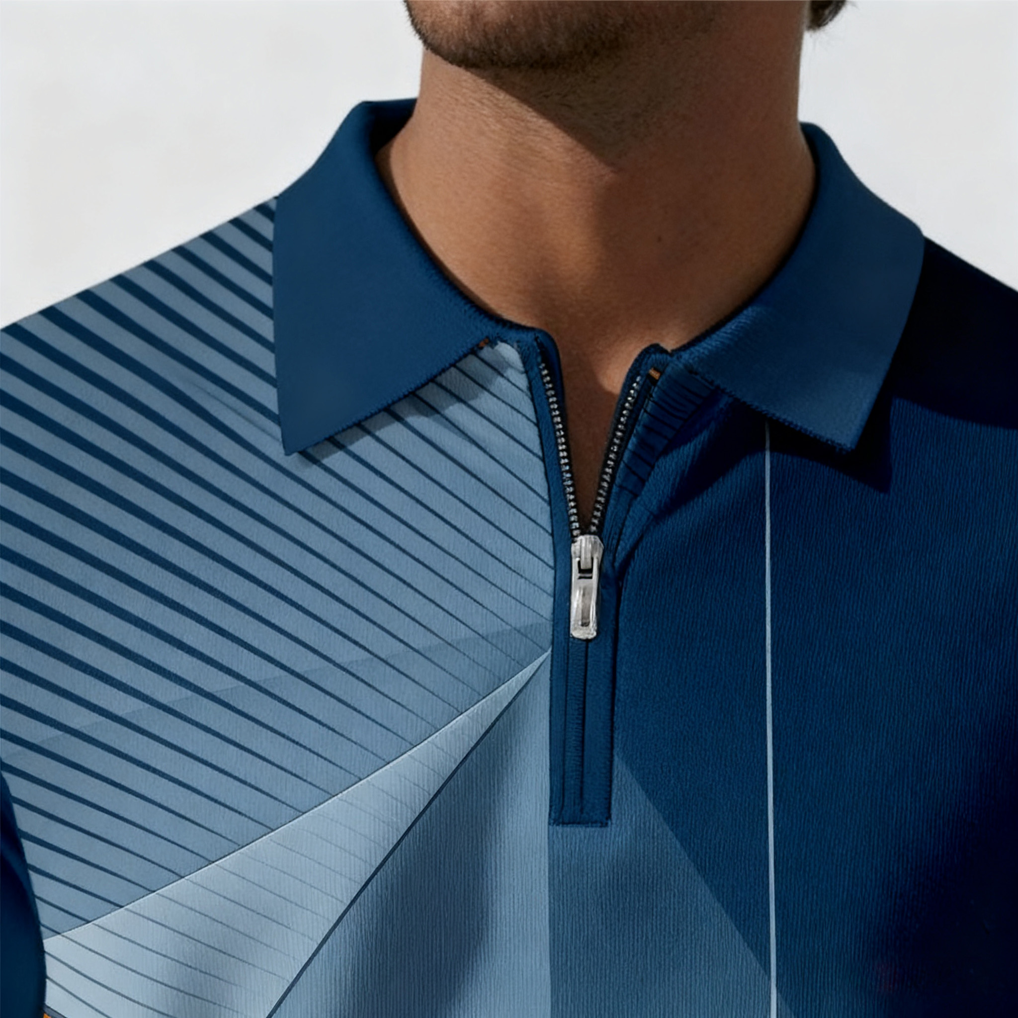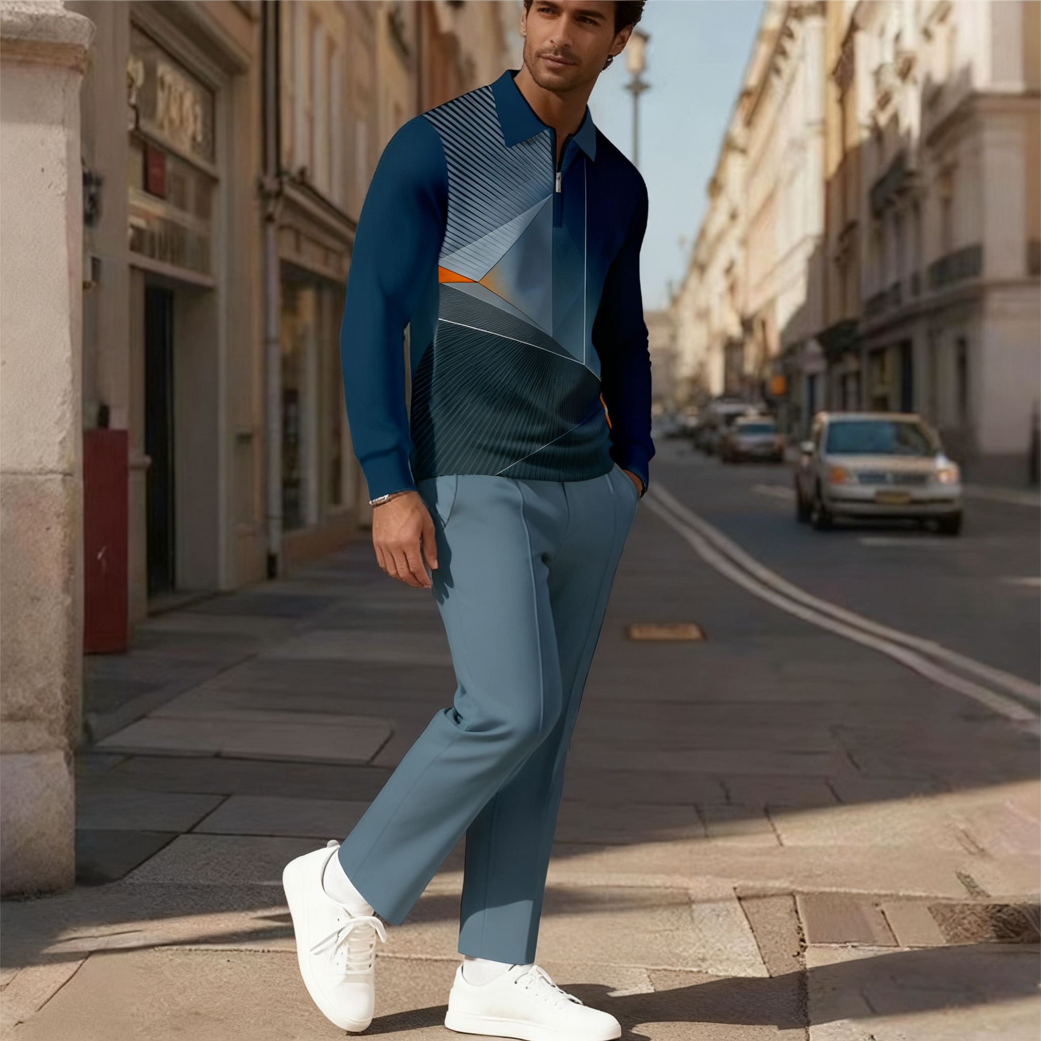 Men's Casual Color Matching Printed Polo-Collar Zipper Long Sleeved Trousers Two-Piece Set