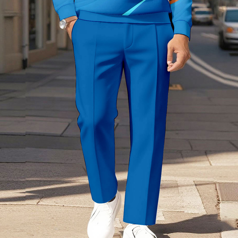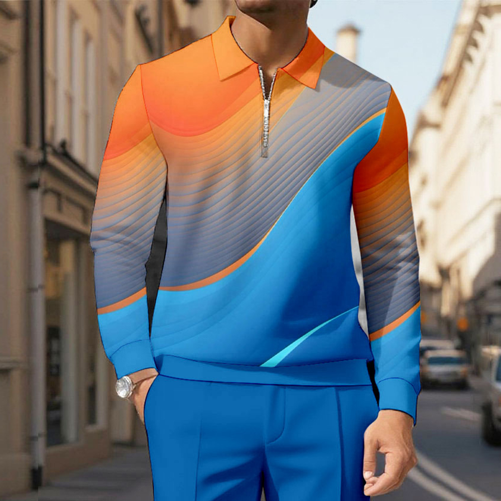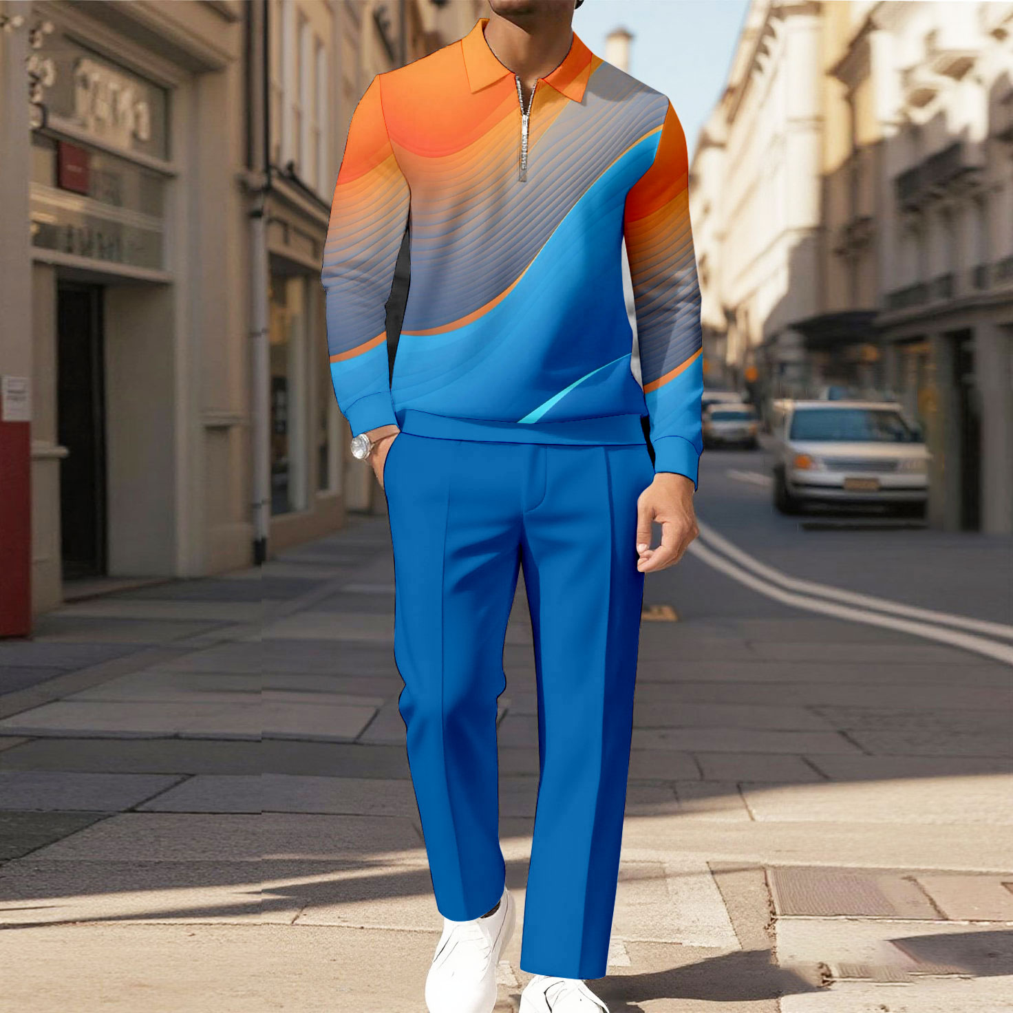 Men's Casual Orange And Blue Gradient Color Matching Printed Polo-Collar Zipper Long Sleeved Trousers Two-Piece Set