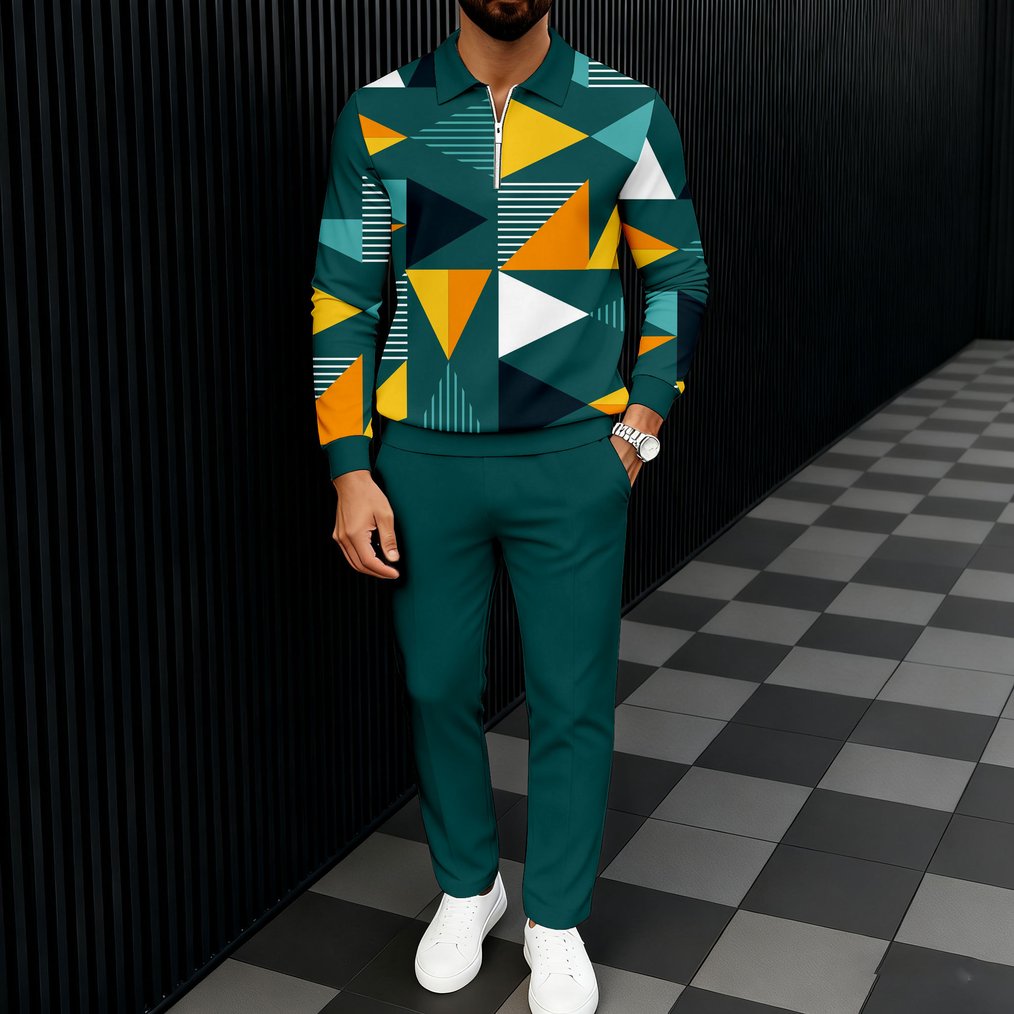 Men's Geometric Patterns Polo-Collar Zipper Long Sleeved Trousers Dark Green Two-Piece Set