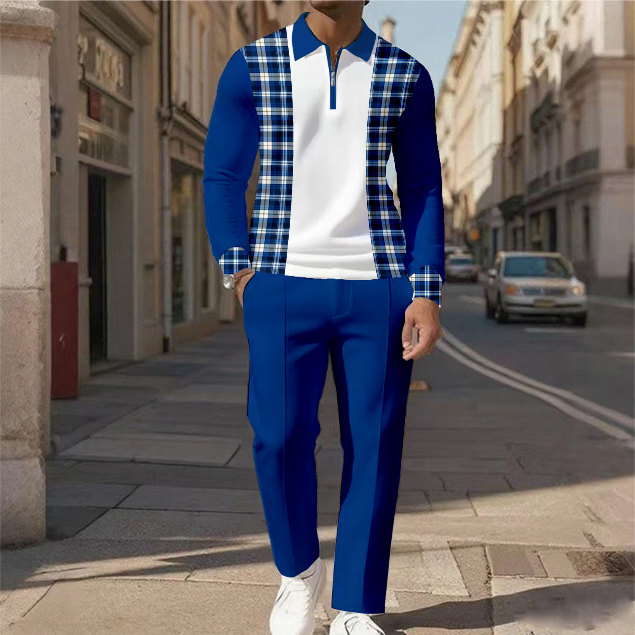 Men's Casual Color Matching Printed Polo-Collar Zipper Long Sleeved Trousers Two-Piece Set