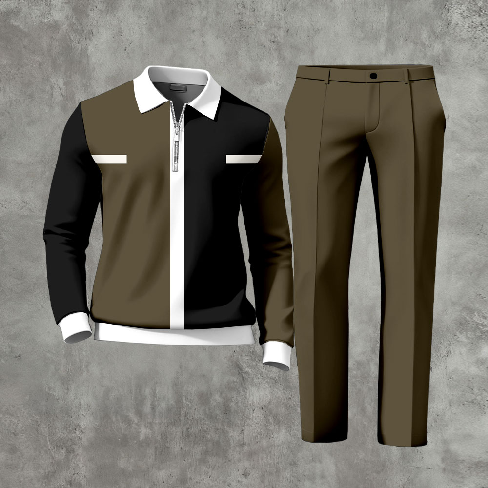 Men's Casual Color Matching Printed Polo-Collar Zipper Long Sleeved Trousers Two-Piece Set