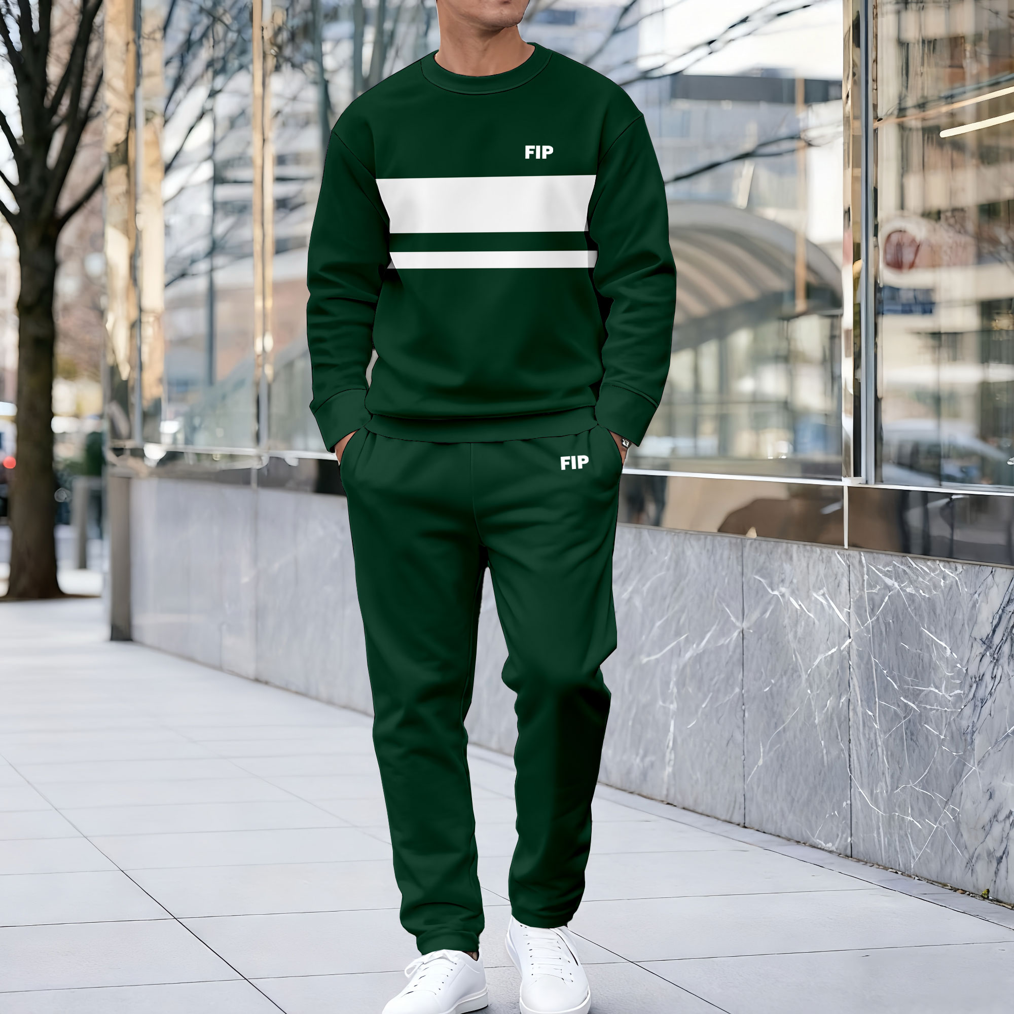 Men's Casual Green & White Color Matching Geometric Printed Round Neck Long Sleeved Sweatshirt & Pants Two-Piece Set
