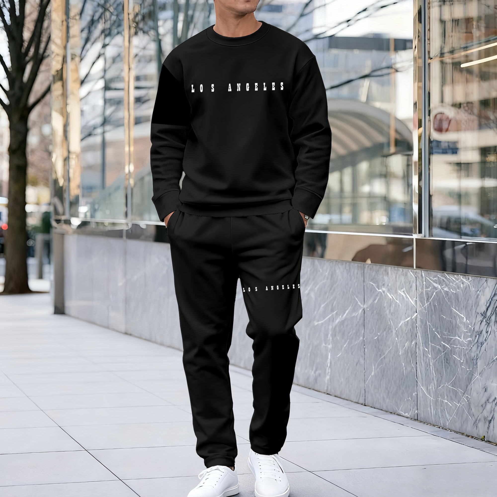 Men's Casual Black Color Word Printed Round Neck Long Sleeved Sweatshirt & Pants Two-Piece Set