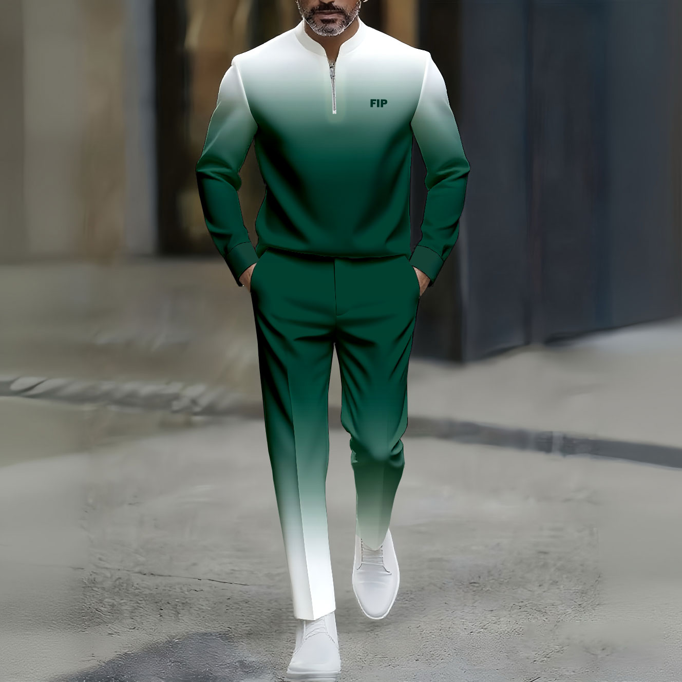 Men's Casual Green&White Gradient Color Matching Printed Round-Neck Zipper Long Sleeved Trousers Two-Piece Set
