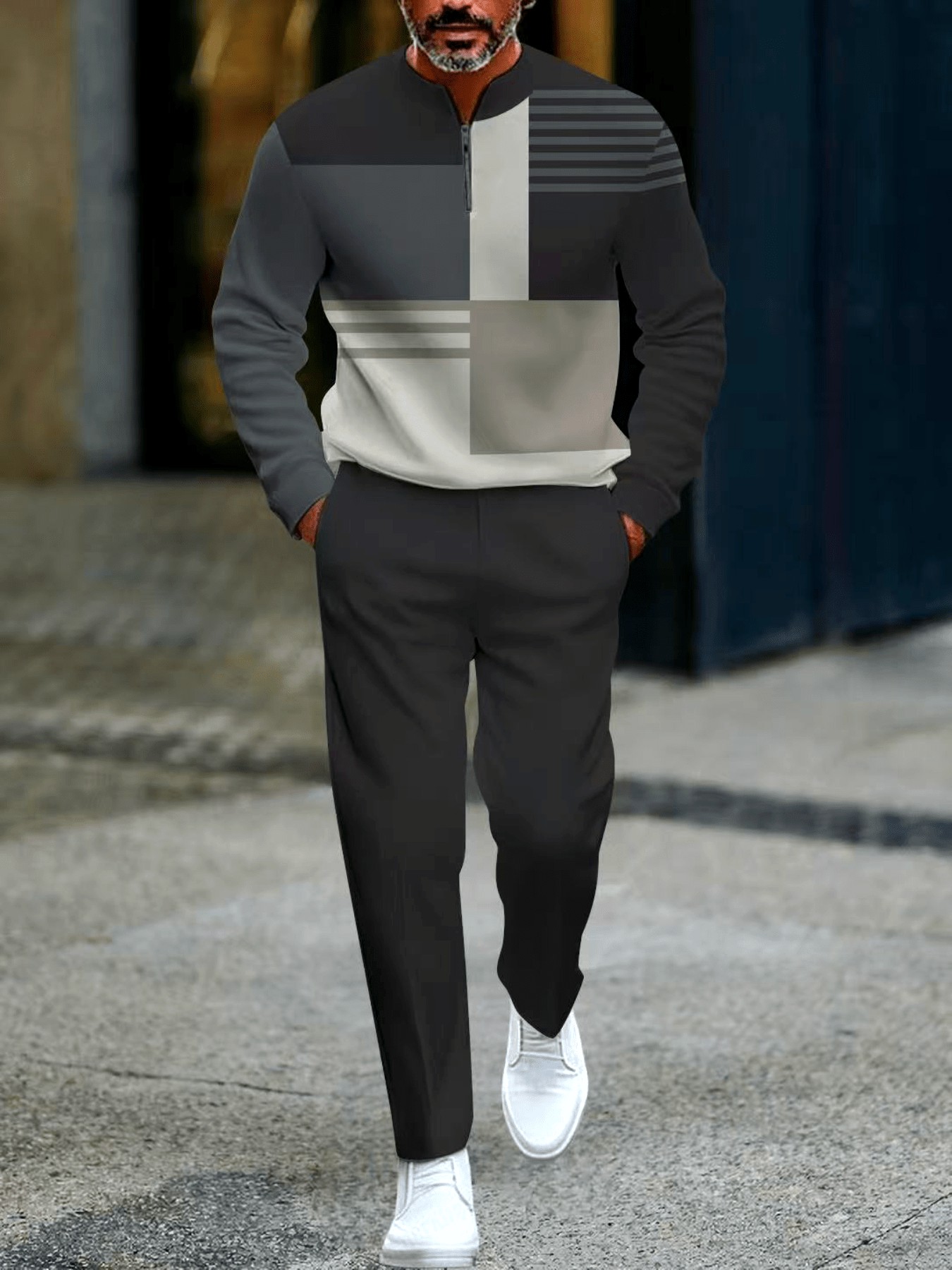 Men's Casual Color Matching Printed Round-Neck Zipper Long Sleeved Trousers Two-Piece Set