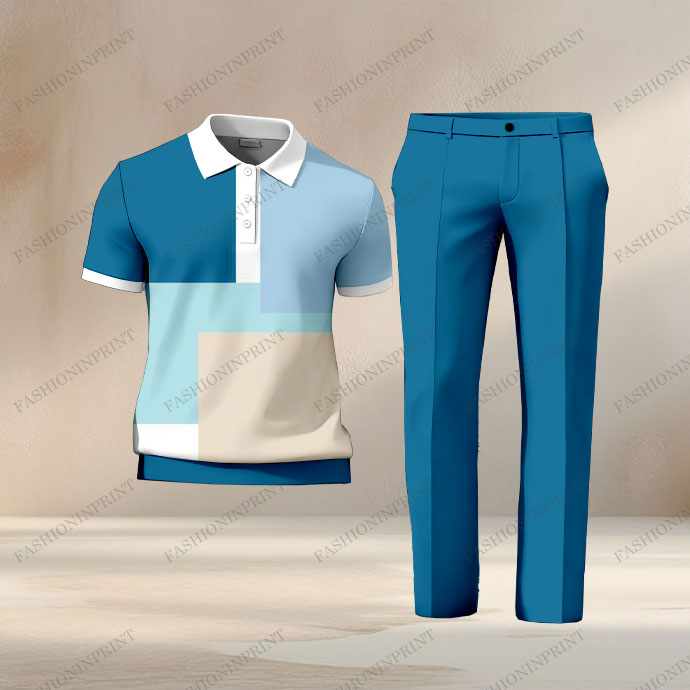 Men's Casual Blue & Apricot Color Matching Geometric Printed Short Sleeved Polo Shirt & Trousers Two-Piece Set