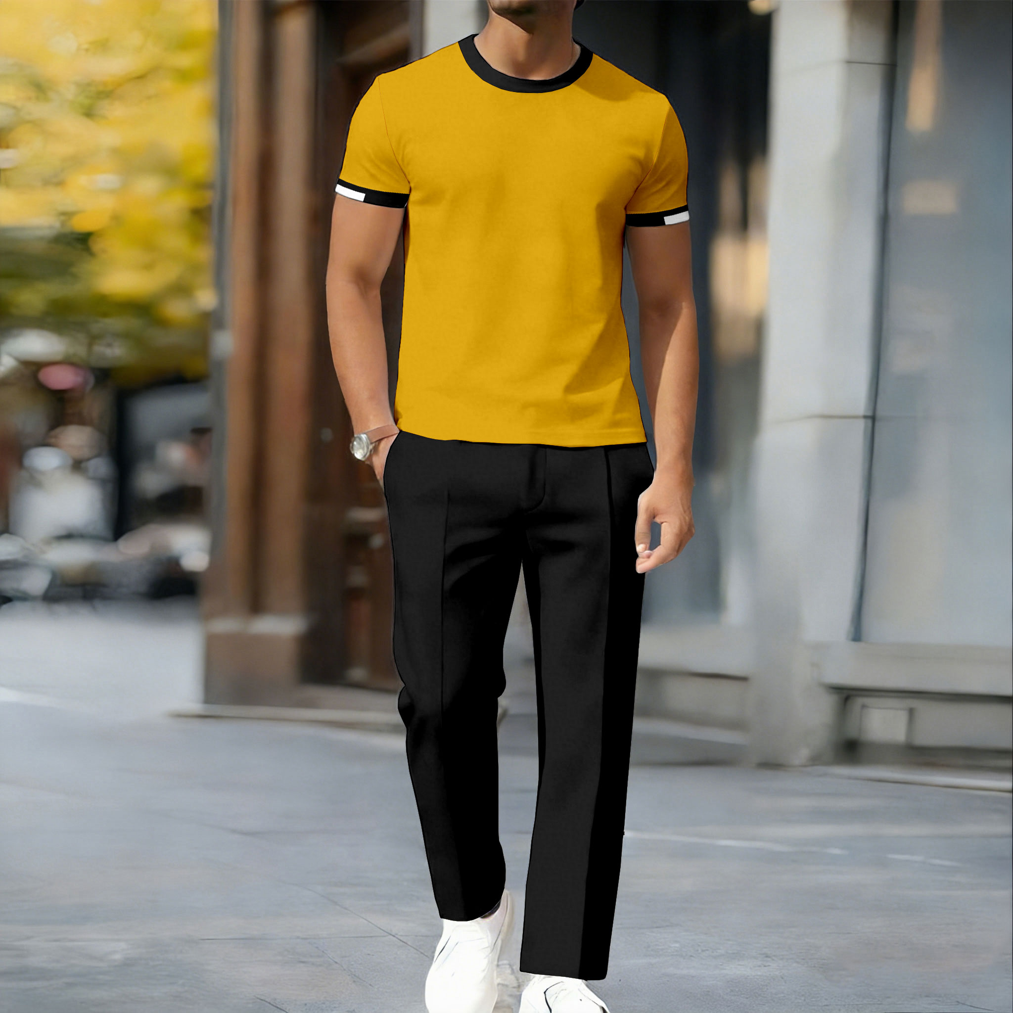 Men's Casual Yellow & Black Color Matching Printed Short Sleeved T-Shirt & Trousers Two-Piece Set
