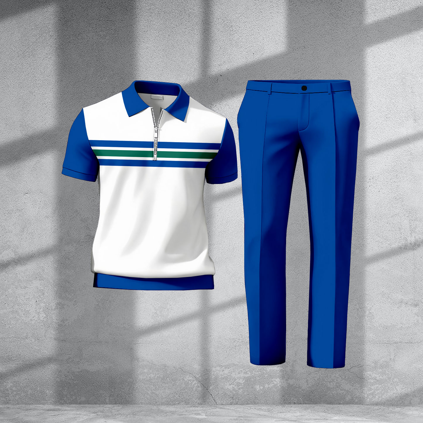 Men's Casual Royal Blue & White Color Matching Striped Printed Short Sleeved Zipper Polo Shirt & Trousers Two-Piece Set