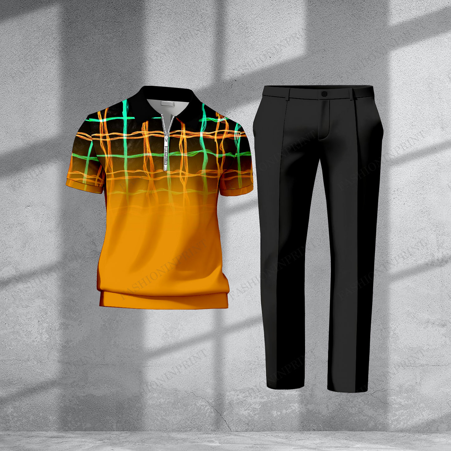 Men's Casual Black & Orange Gradient Color Matching Checkered Printed Short Sleeved Zipper Polo Shirt & Trousers Two-Piece Set