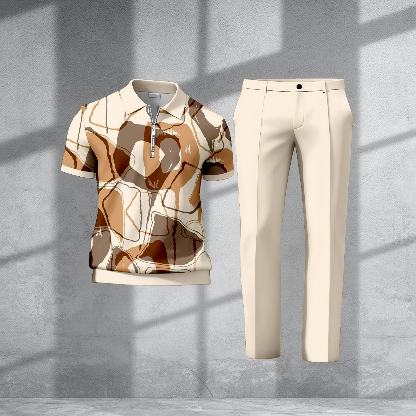 Men's Casual Beige & Orange Color Matching Printed Short Sleeved Zipper Polo Shirt & Trousers Two-Piece Set