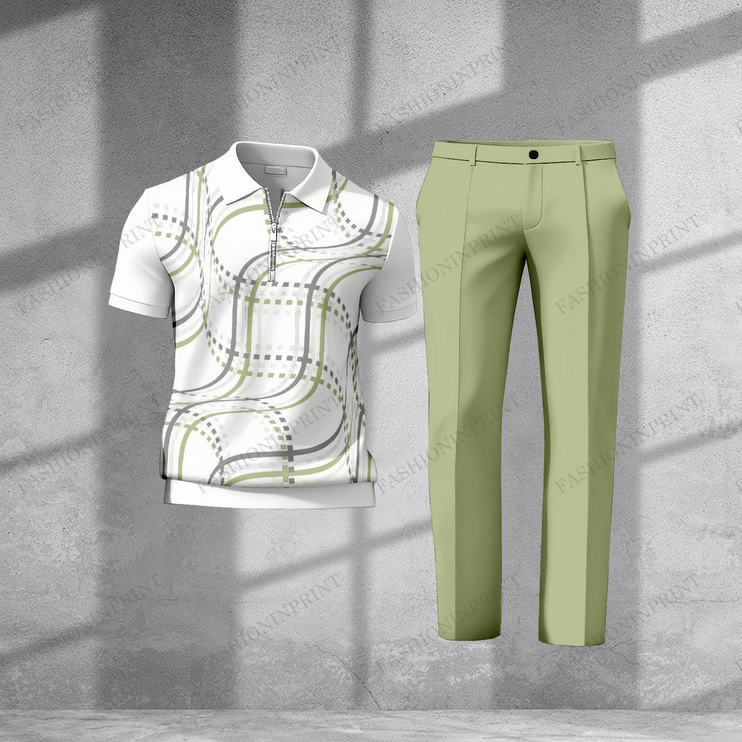 Men's Casual Light Green & White Color Matching Checkered Printed Short Sleeved Zipper Polo Shirt & Trousers Two-Piece Set