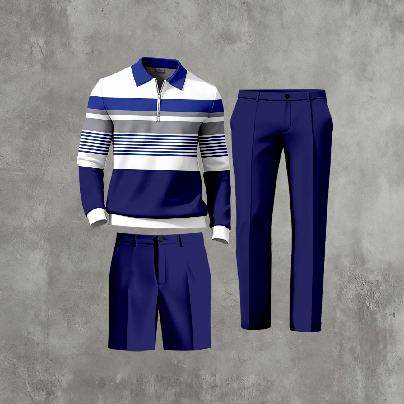 Men's Casual Navy & White Color Matching Striped Printed Zipper Long Sleeved Polo Shirt & Trousers & Shorts Three-Piece Set