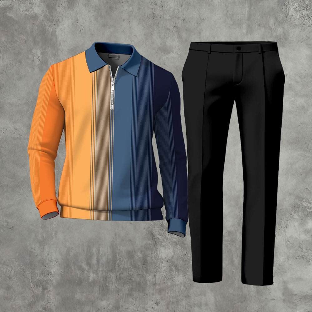 Men's Casual Navy Blue & Orange Color Matching Striped Printed Zipper Long Sleeved Polo Shirt & Black Trousers Two-Piece Set