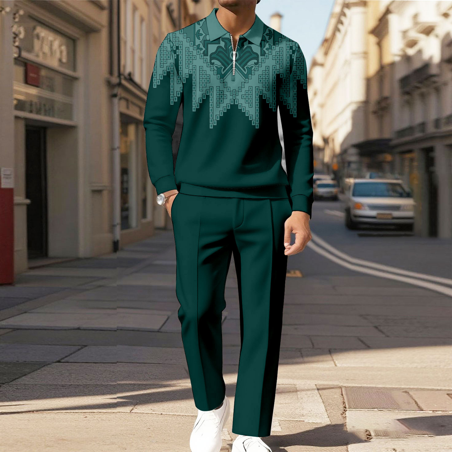 Men's Casual Green Color Ethnic Style Printed Zipper Long Sleeved Polo Shirt & Trousers Two-Piece Set
