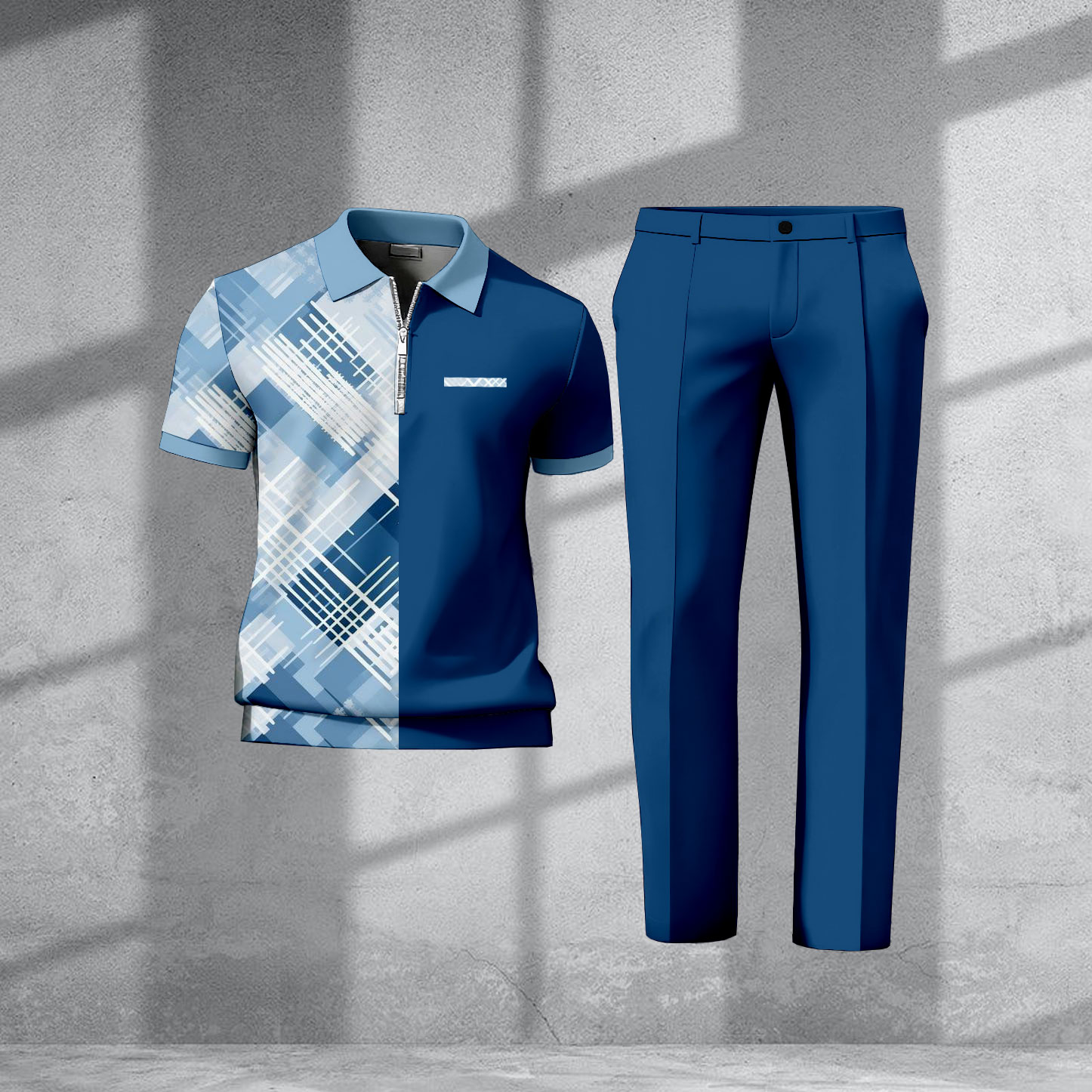 Men's Casual Blue & Royal Blue Color Matching Geometric Printed Zipper Short Sleeved Polo Shirt & Trousers Two-Piece Set