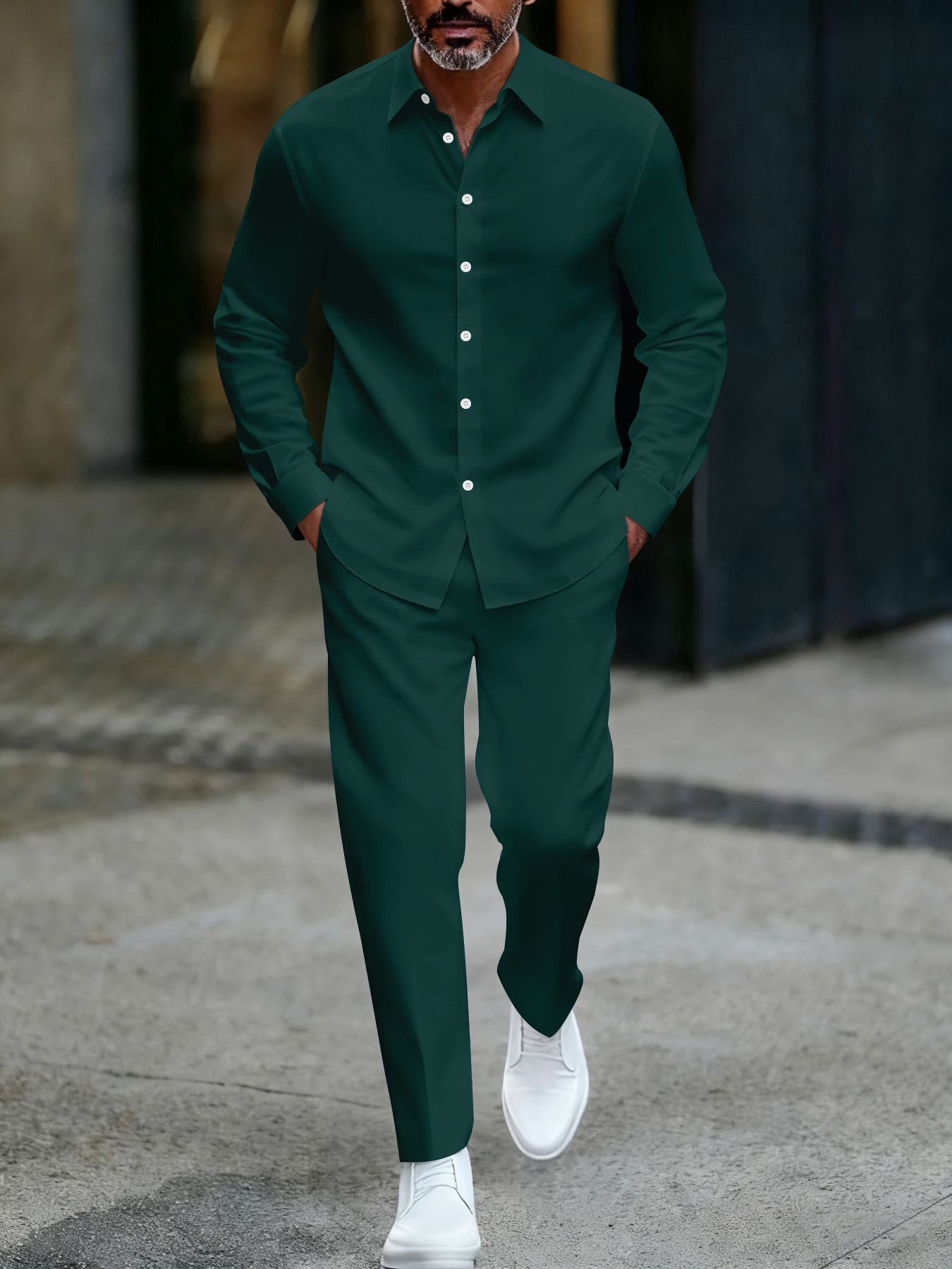 Men's Casual Dark Green Lapel Collar Long Sleeved Shirt & Trousers Two-Piece Set