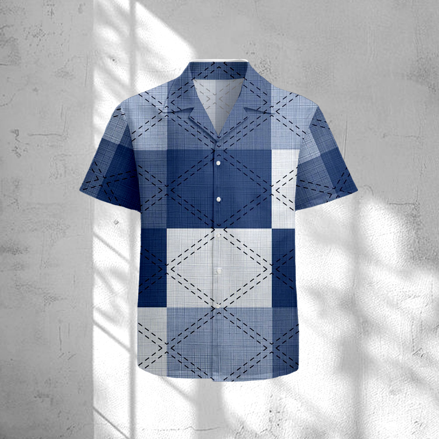 Men's Casual Denim Blue Color Matching Checkered Print Short-Sleeve Shirt