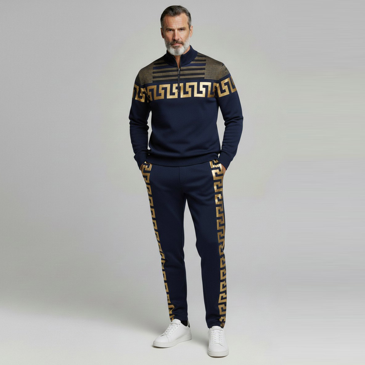 Men's Casual Gold & Navy Color Matching Baroque Style Printed Polo-Collar Zipper Long Sleeved Trousers Two-Piece Set