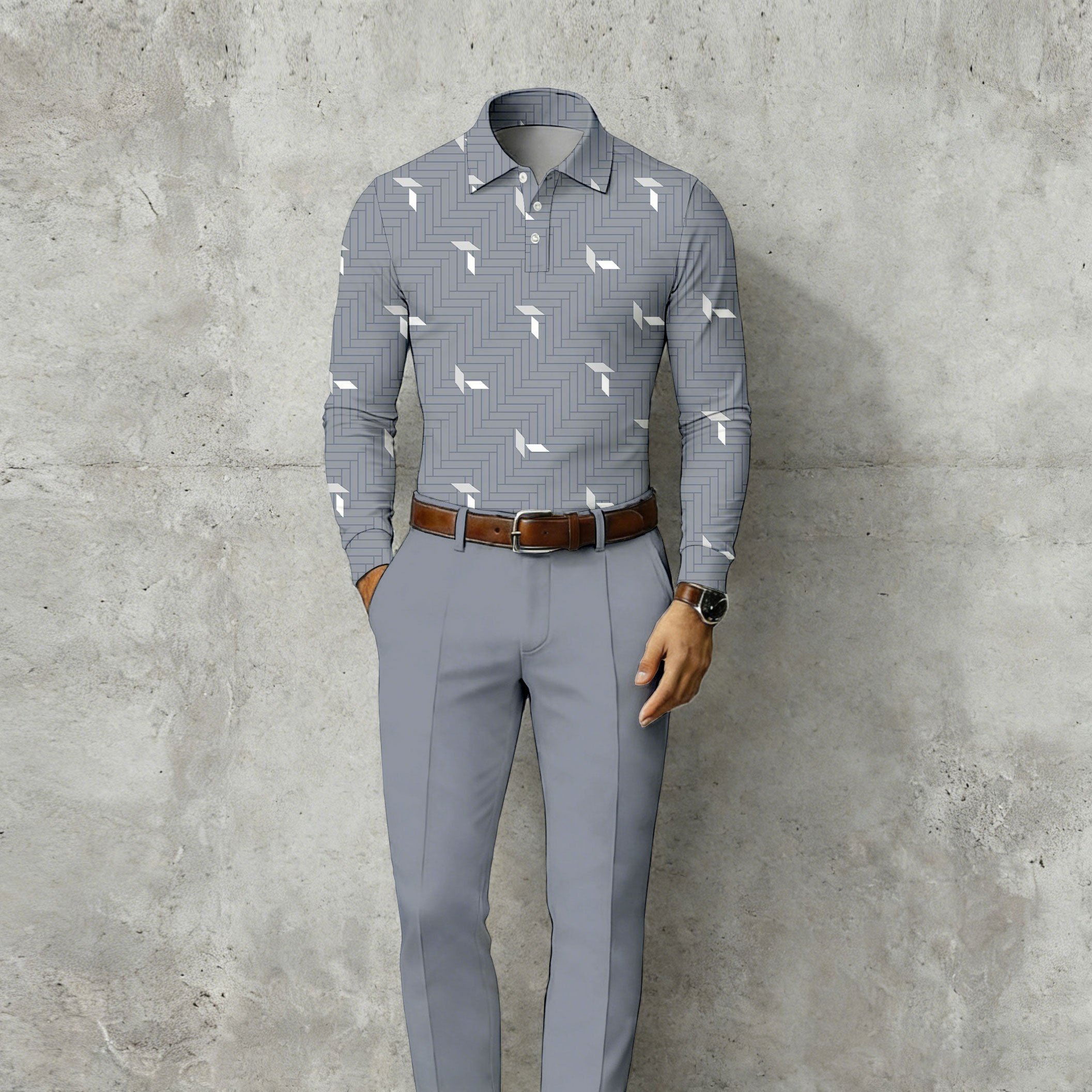 Men's Casual Gray Color Matching Checkered Printed Long Sleeved Polo Shirt & Trousers Two-Piece Set