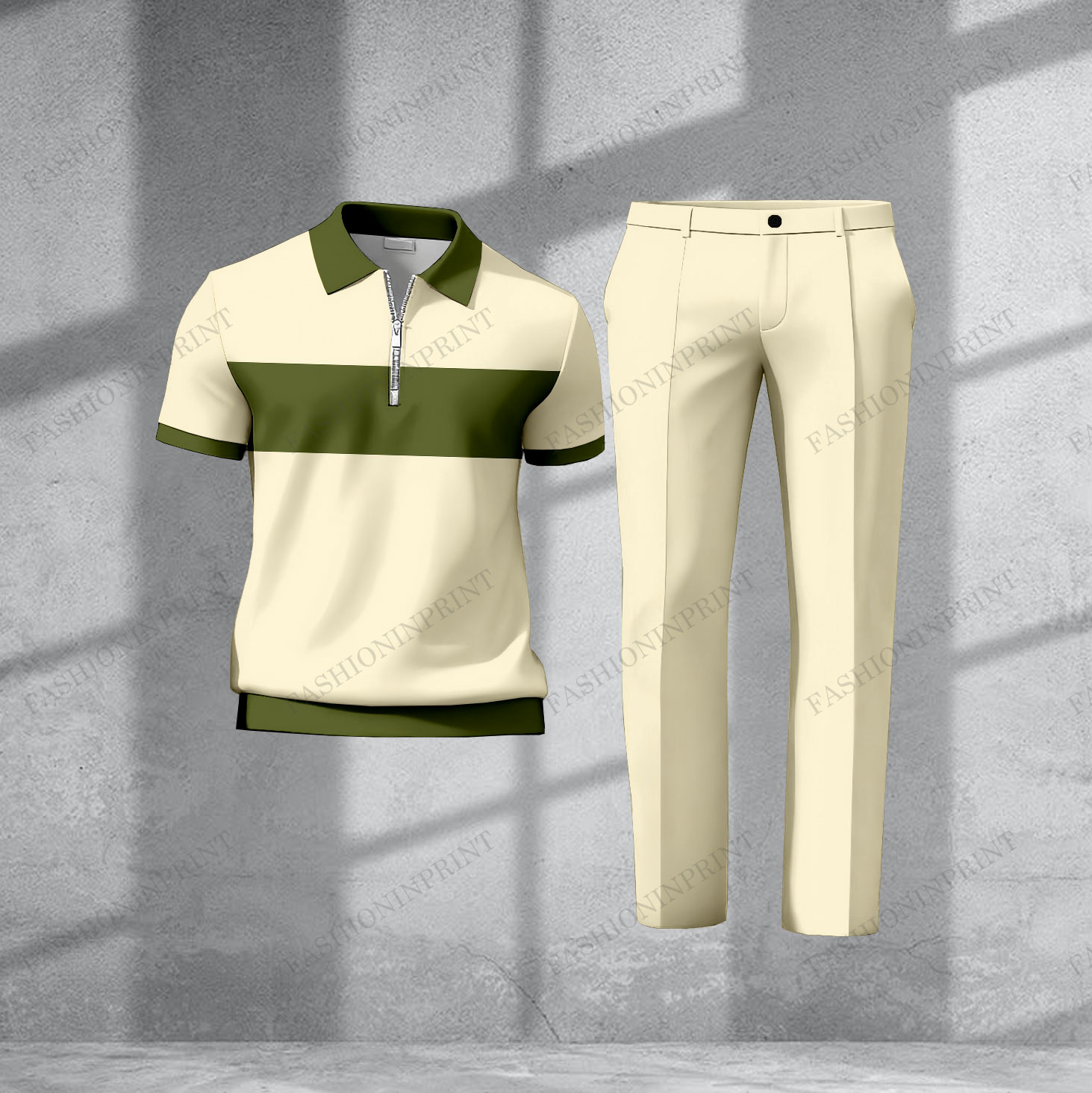 Men's Casual Green & Apricot Geometric Pattern Short-Sleeved Polo Shirt And Trousers Two-Piece Set