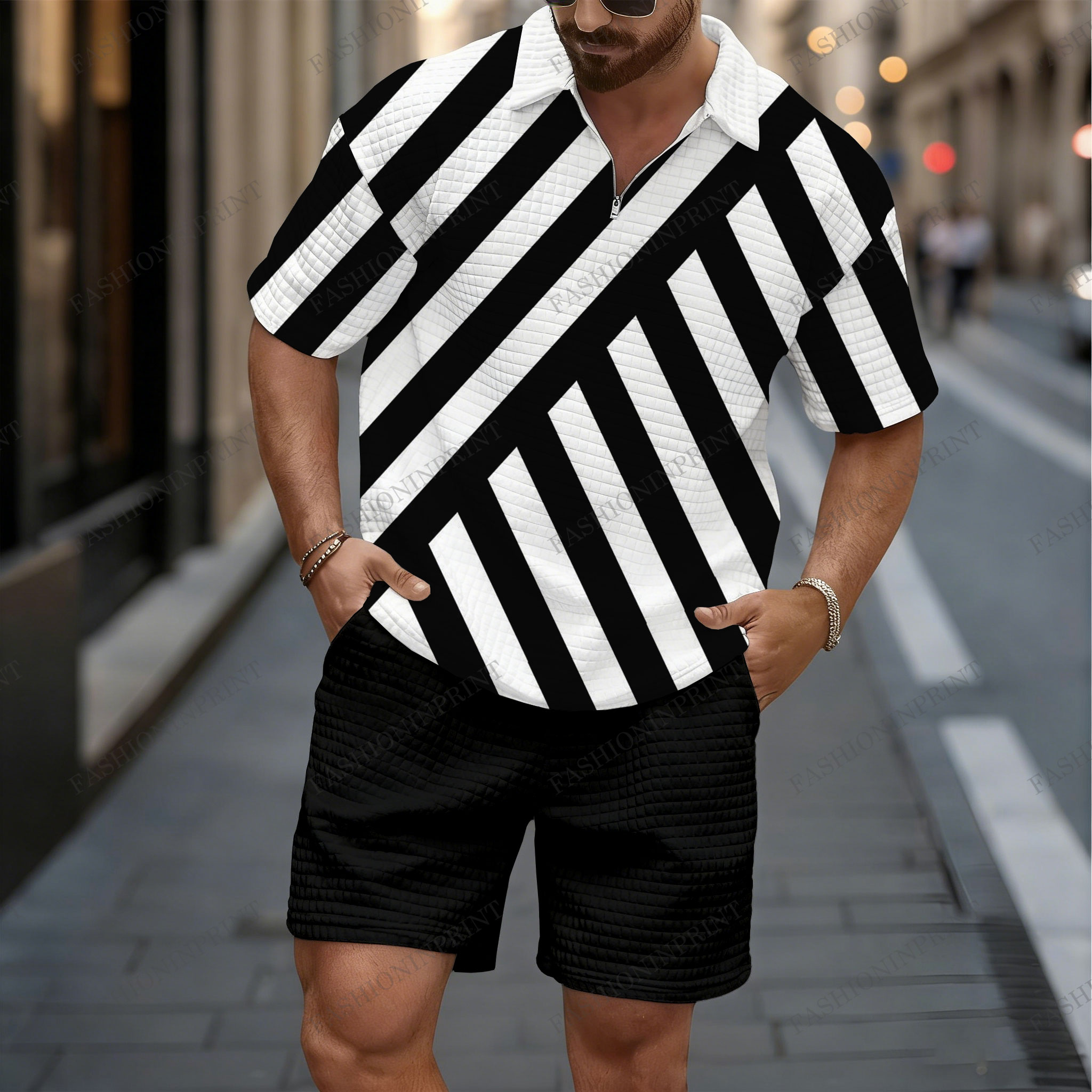 Men's Casual Black Stripes Half-Zip Short-Sleeved Shirt And Shorts Two-Piece Set