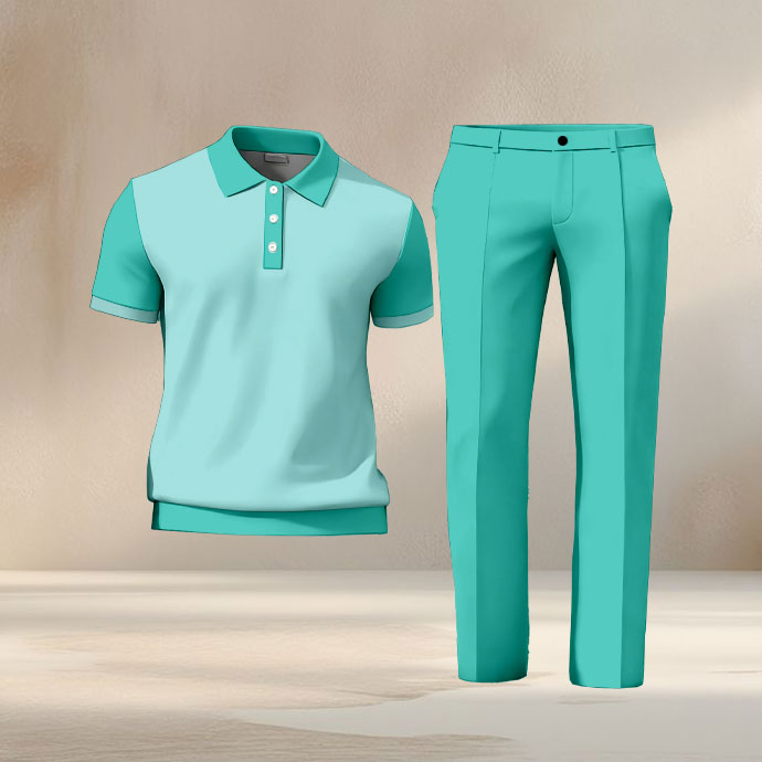 Men's Casual Lake Green Color Matching Printed Short Sleeved Polo Shirt & Trousers Two-Piece Set