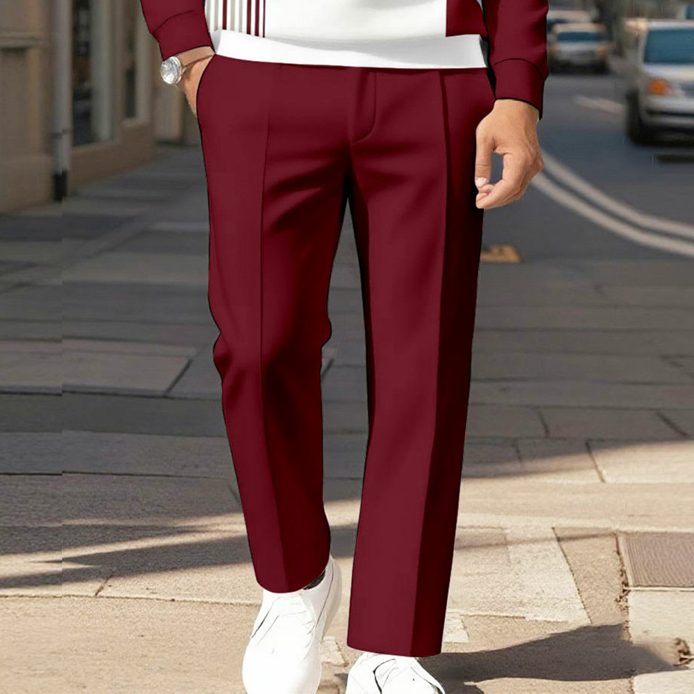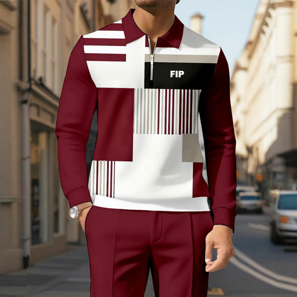Men's Casual Maroon Color Matching Geometric Printed Polo-Collar Zipper Long Sleeved Trousers Two-Piece Set