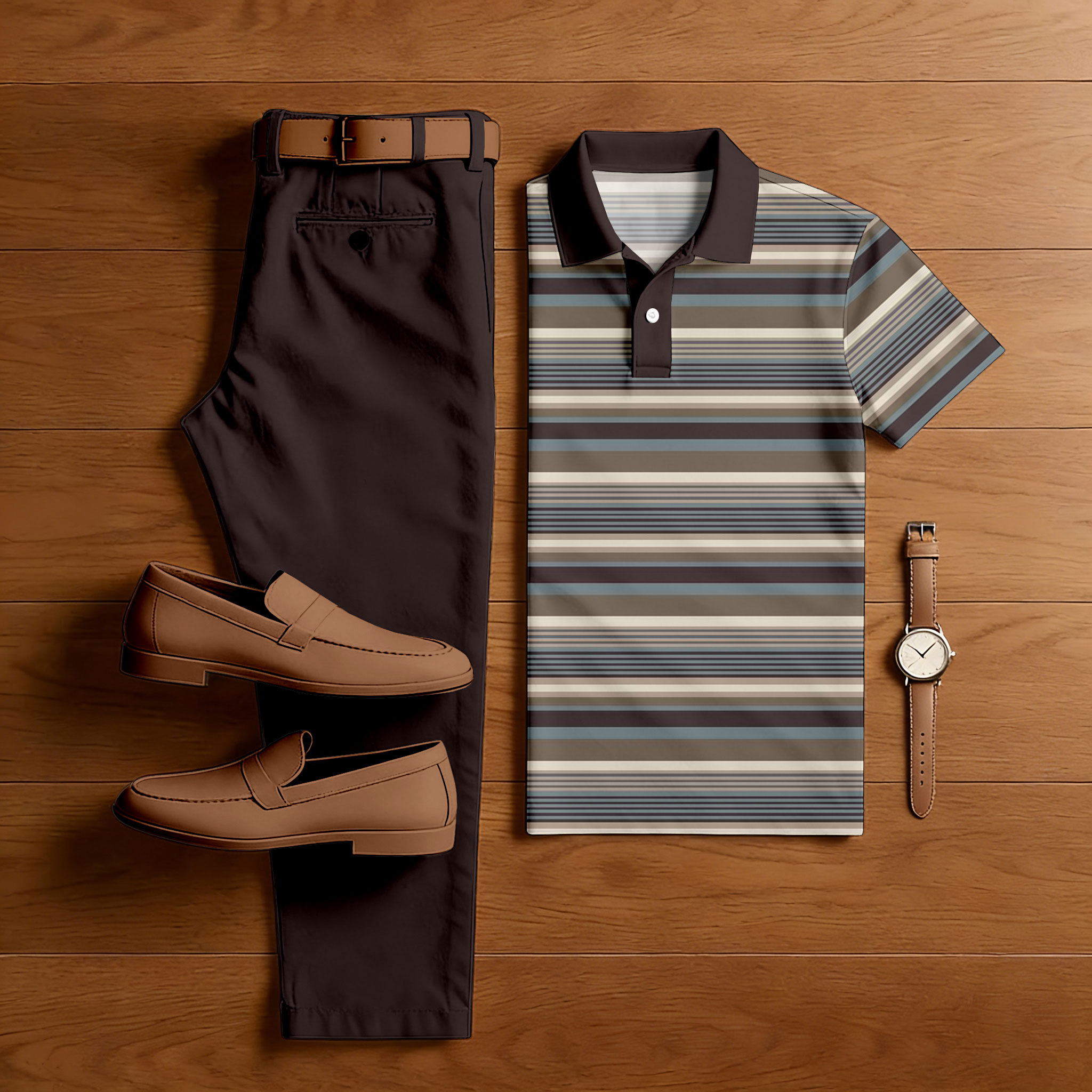 Men's Casual Multi Coffee Color Matching Striped Printed Short Sleeved Polo Shirt & Trousers Two-Piece Set