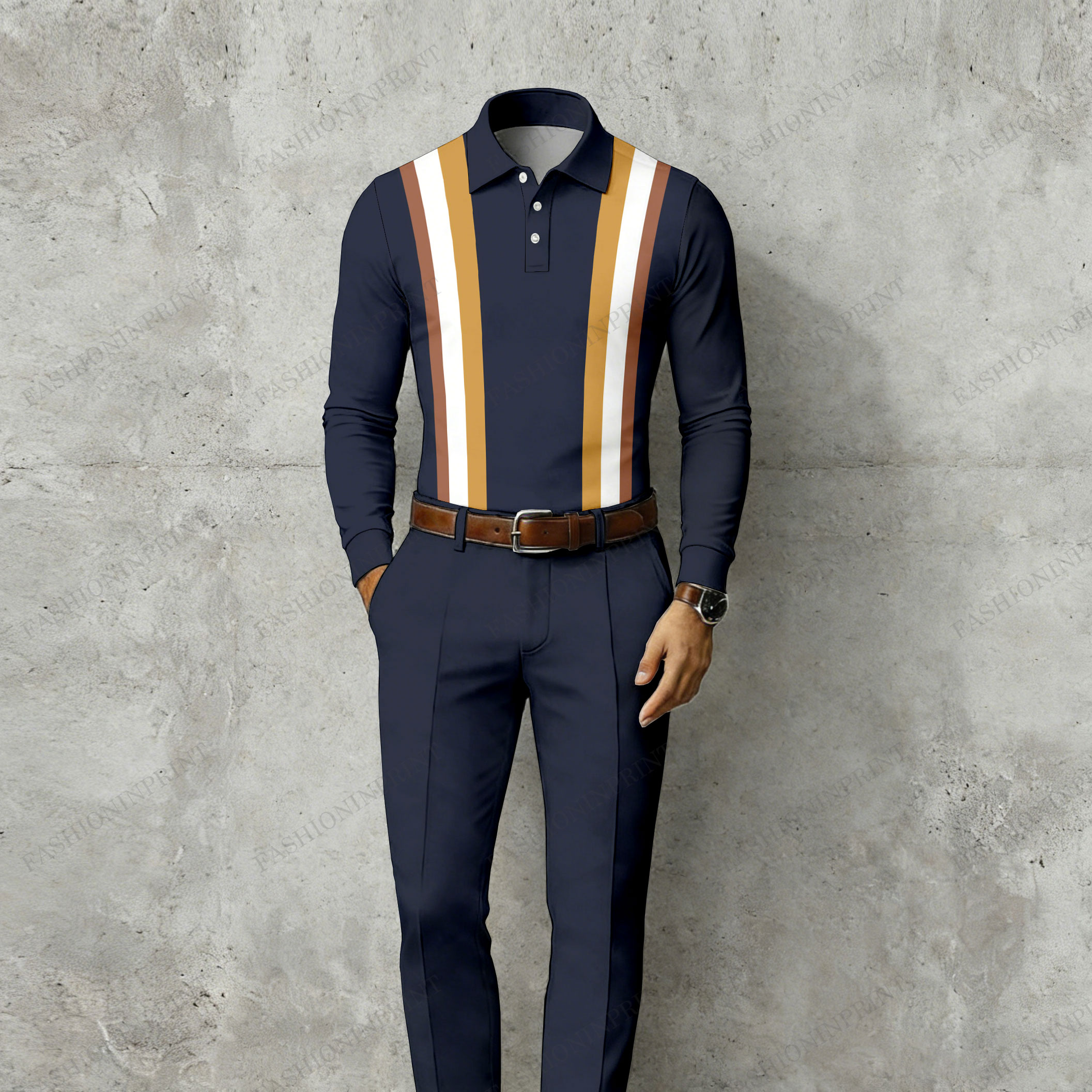 Men's Casual Navy Blue Color Matching Striped Printed Long Sleeved Polo Shirt & Trousers Two-Piece Set