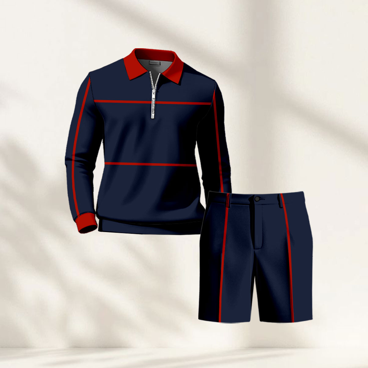 Men's Casual Navy Blue & Red Color Matching Striped Printed Zipper Long Sleeved Polo Shirt & Five-Point Pants Two-Piece Set