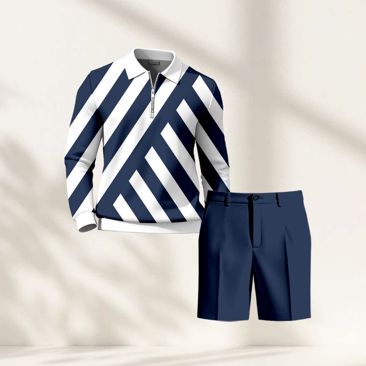 Men's Casual Navy Blue & White Color Matching Striped Printed Zipper Long Sleeved Polo Shirt & Five-Point Pants Two-Piece Set