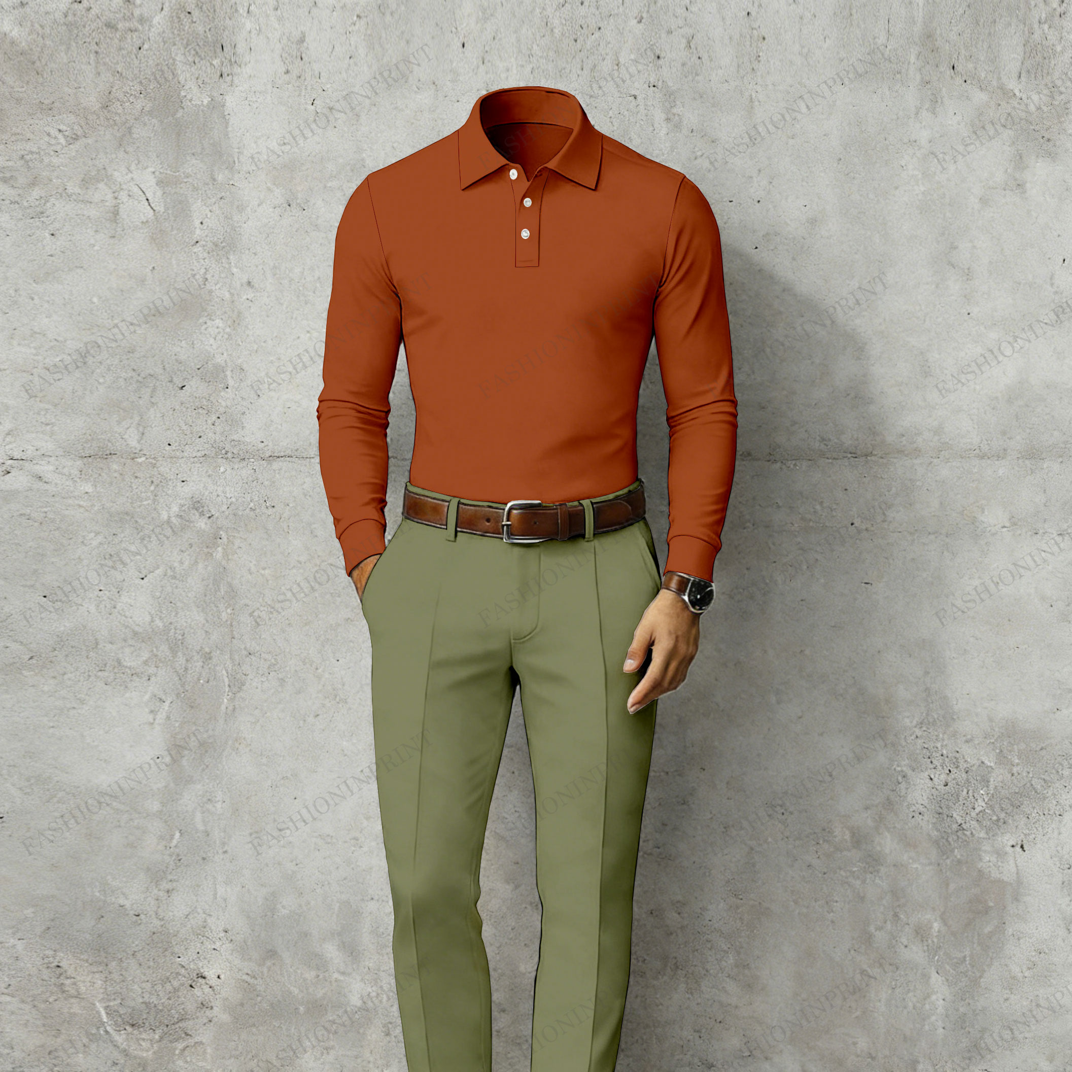 Men's Casual Orange & Green Color Matching Long Sleeved Polo Shirt & Trousers Two-Piece Set