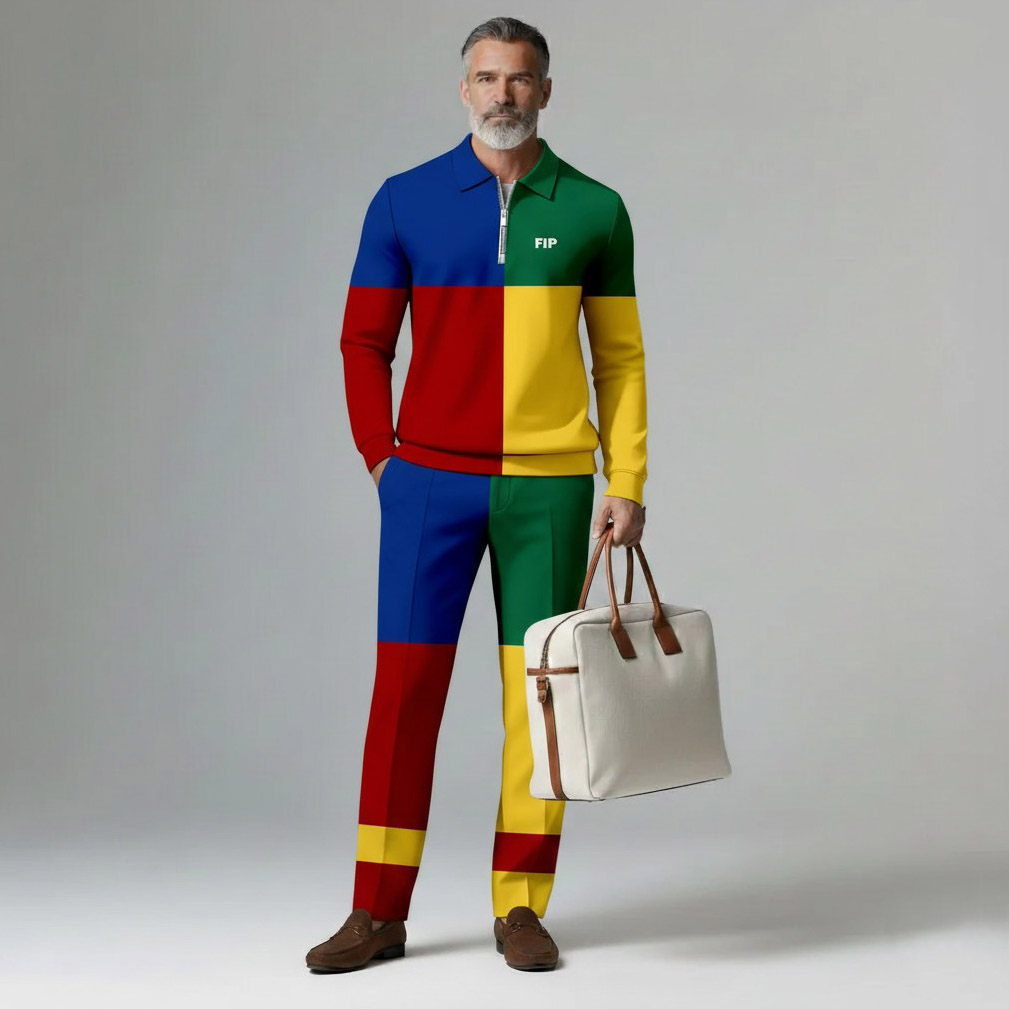 Men's Casual Red & Royal Blue & Green & Yellow Color Matching Chekered Printed Polo-Collar Zipper Long Sleeved Trousers Two-Piece Set
