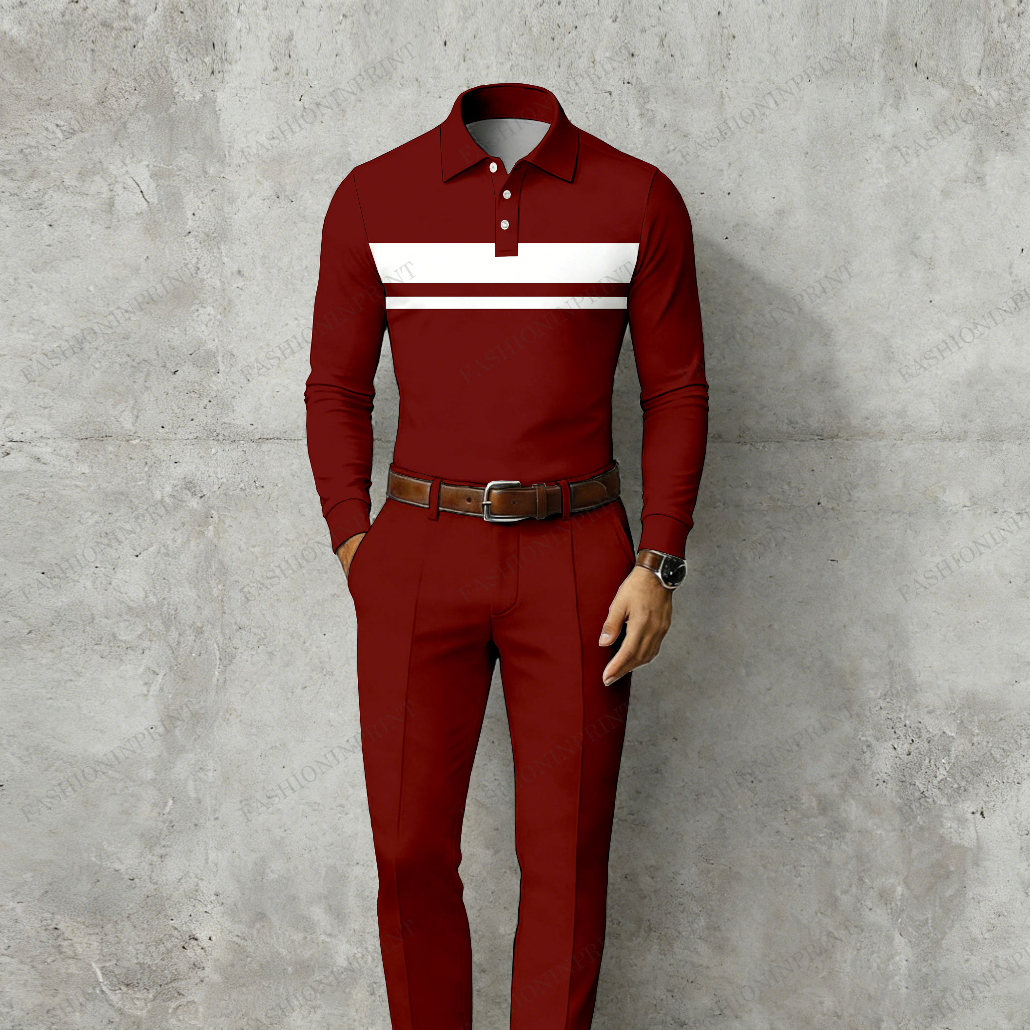 Men's Casual Red & White Color Matching Striped Printed Long Sleeved Polo Shirt & Trousers Two-Piece Set
