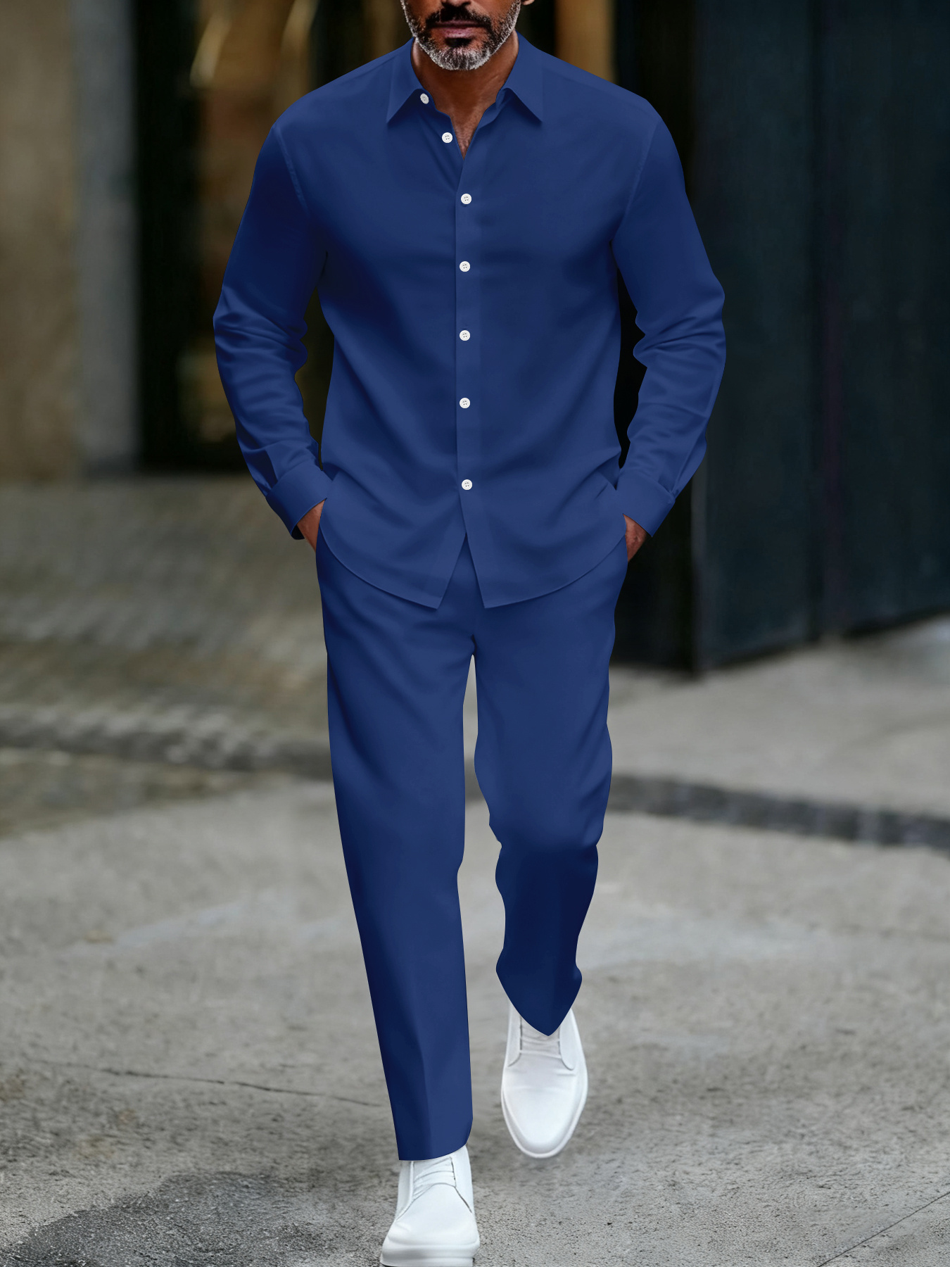 Men's Casual Royal Blue Lapel Collar Long Sleeved Shirt & Trousers Two-Piece Set