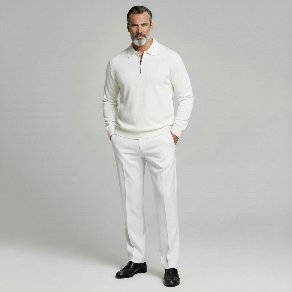 Men's Casual White Color Polo-Collar Zipper Long Sleeved Trousers Two-Piece Set