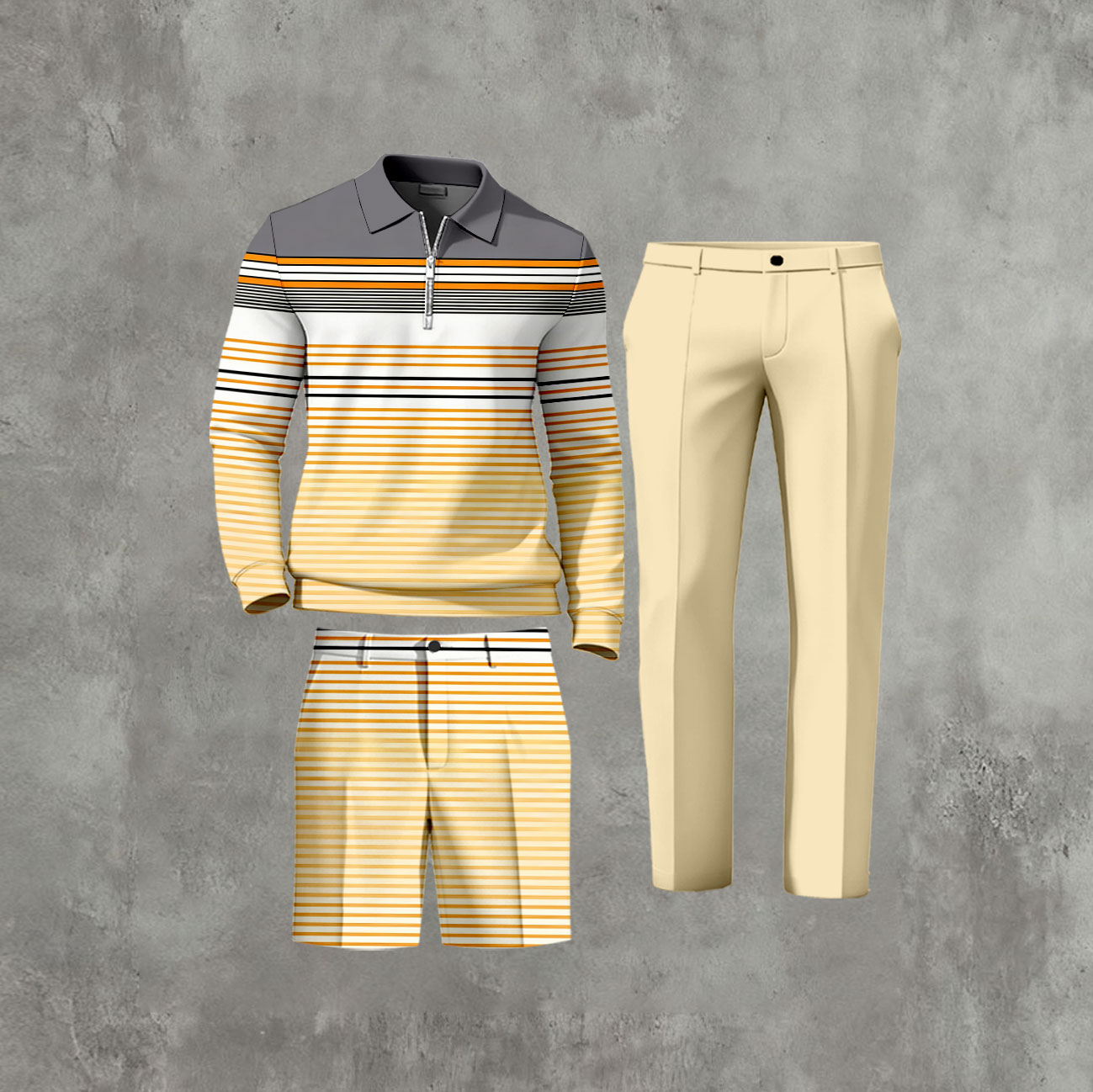 Men's Casual Yellow & Gray Color Matching Striped Printed Zipper Long Sleeved Polo Shirt & Trousers & Shorts Three-Piece Set