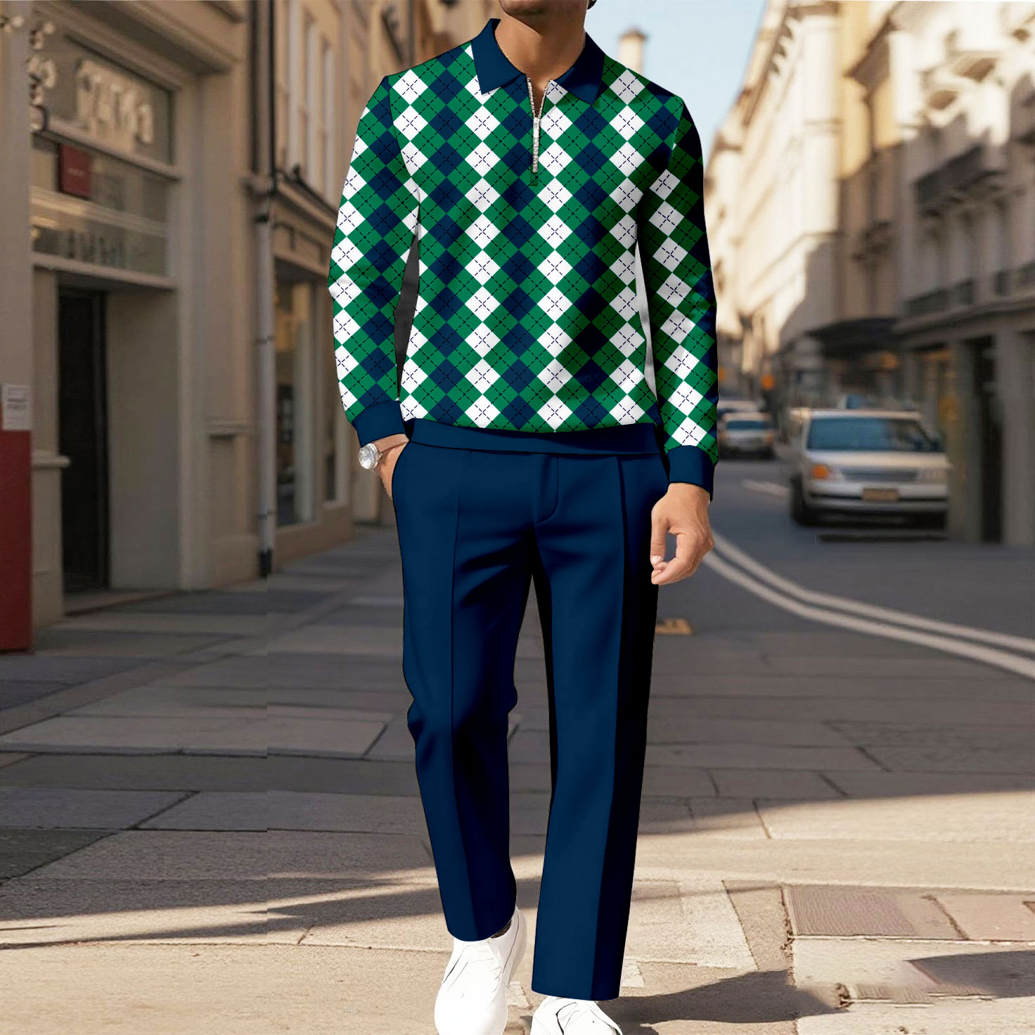 Men's Casual Color Matching Printed Polo-Collar Zipper Long Sleeved Trousers Two-Piece Set