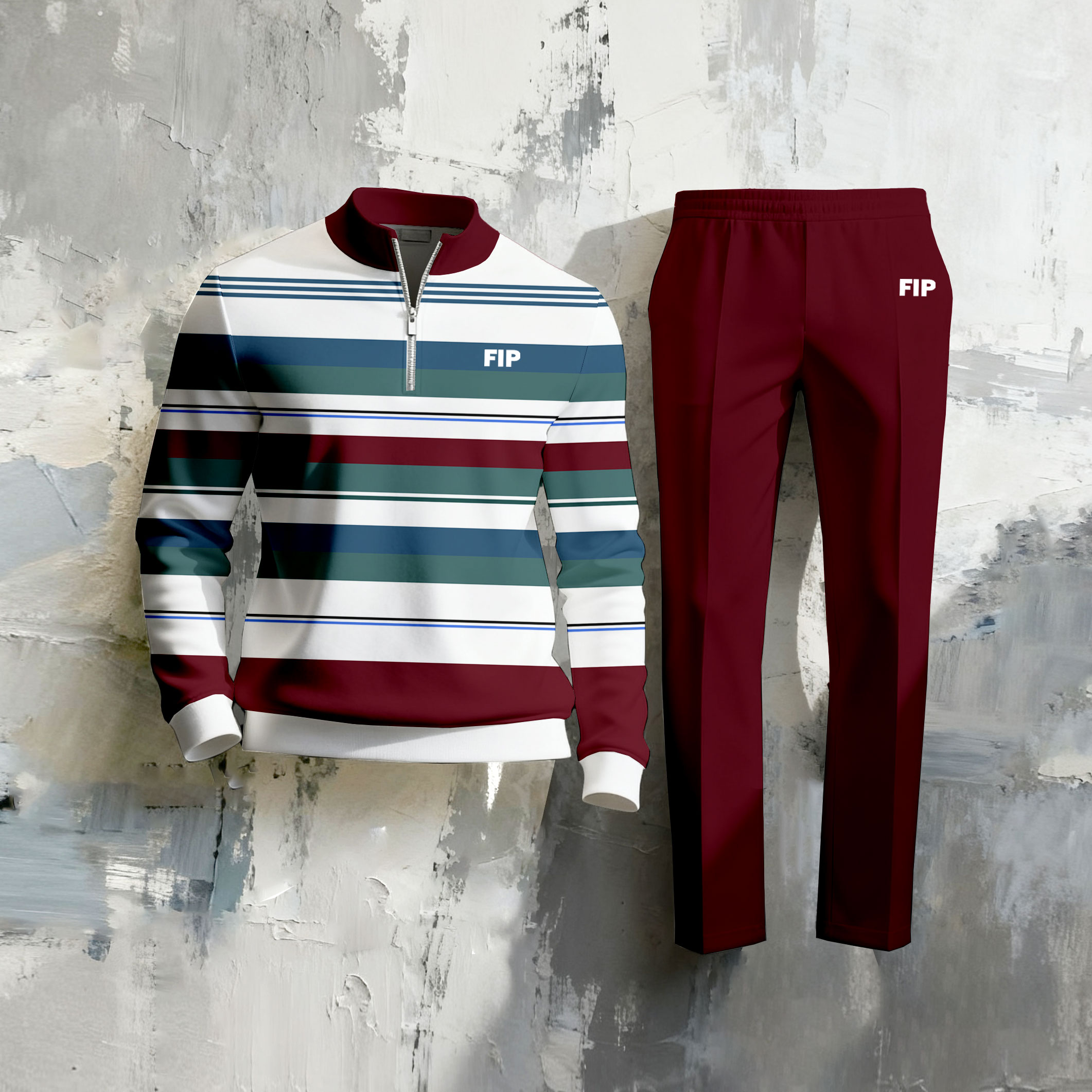 Men's Christmas Color Matching Printed Stand-Collar Zipper Long Sleeved Trousers Two-Piece Set