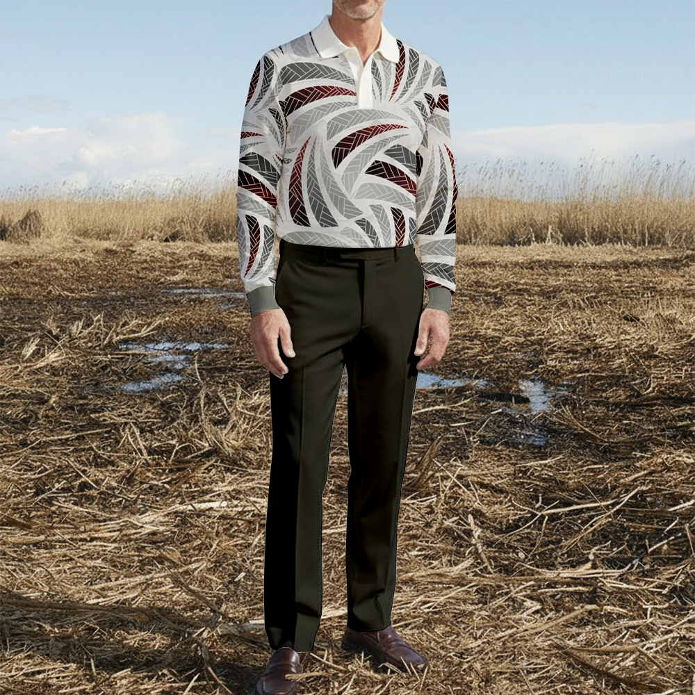 Men's Color Matching Printed Polo-Collar Long Sleeved Trousers Two-Piece Set