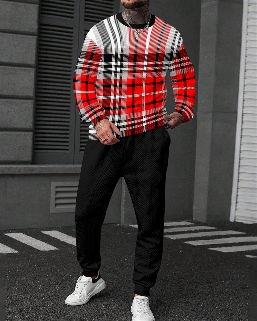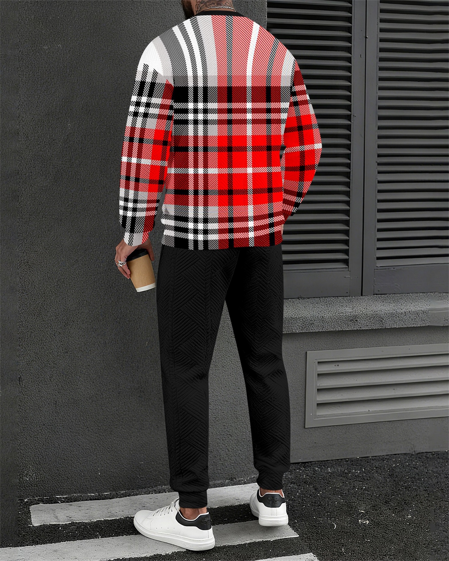 Men's Colorblock Print Textured Long-Sleeved Trousers Set 614