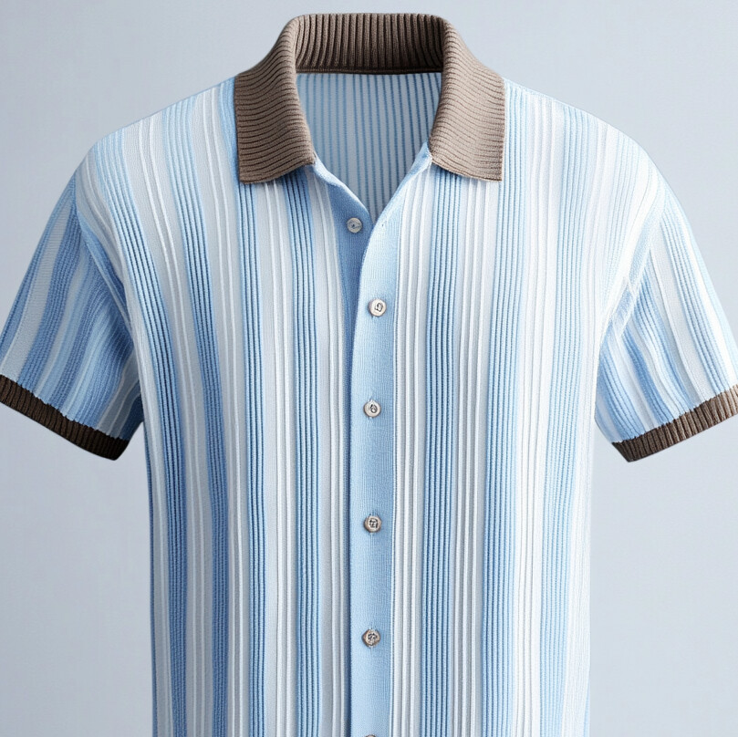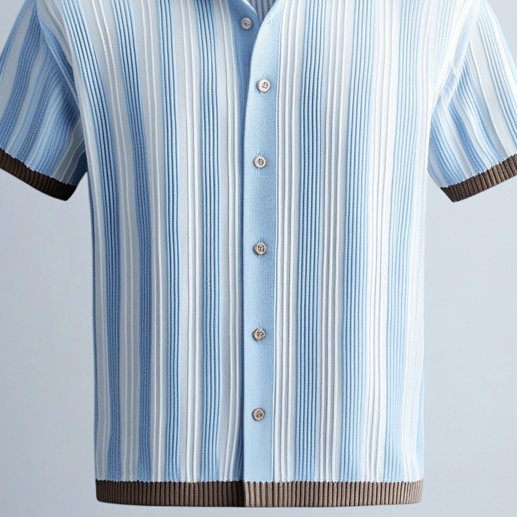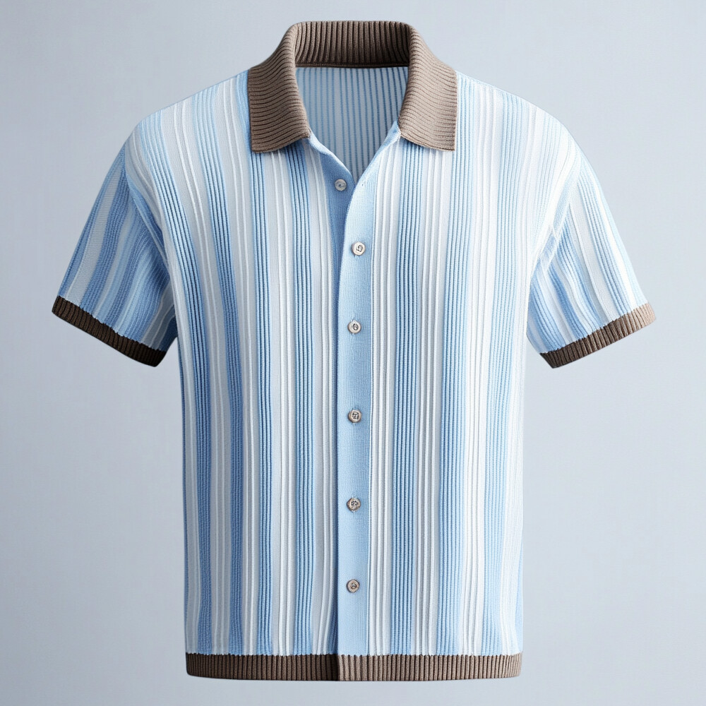 Men's Colorblock Stripes Knitted Turndown Collar Button Short Sleeve Shirt