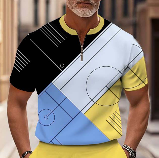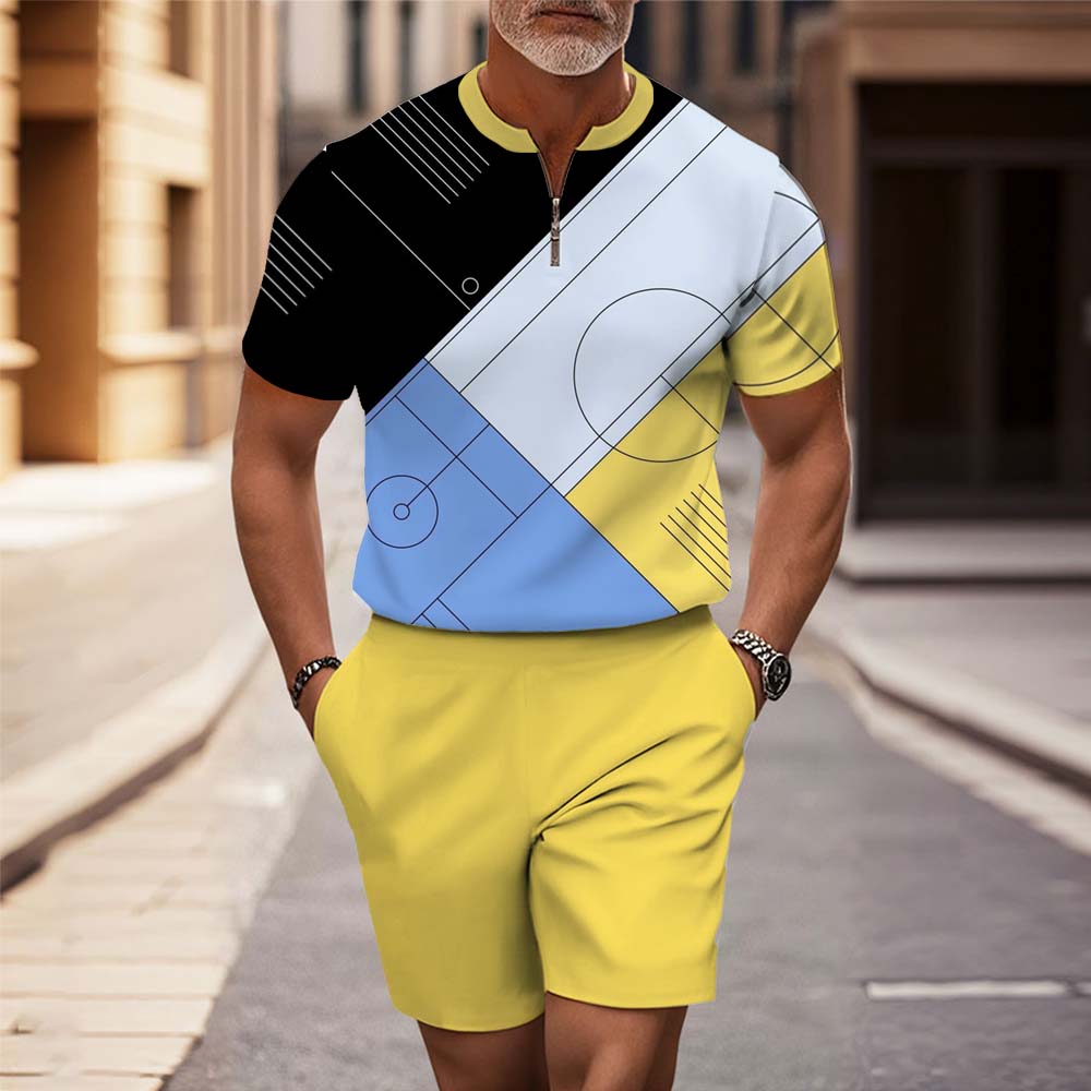 Men's Fashion Casual Round-Neck Geometric Printed Short-Sleeved Two-Piece Set