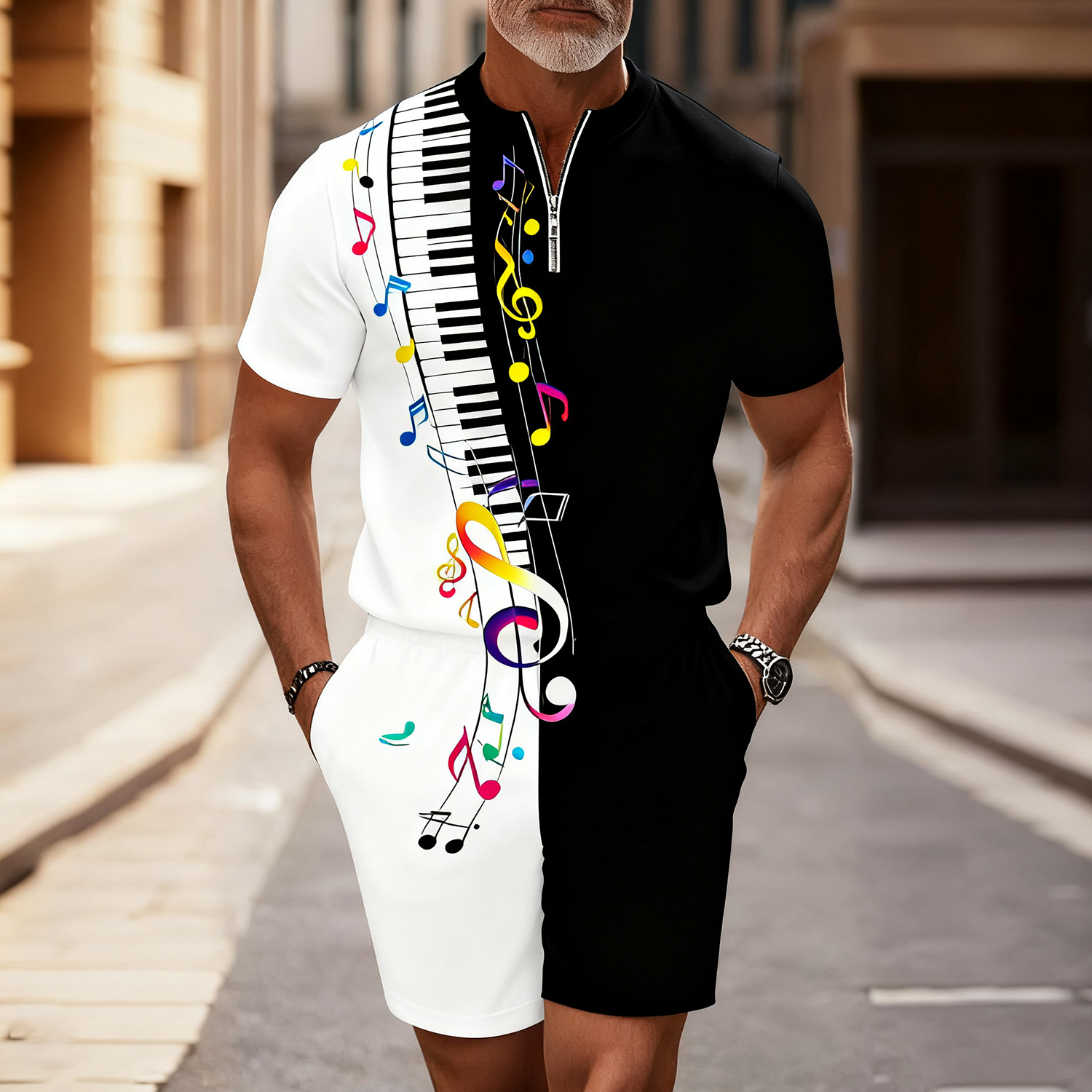 Men's Fashion Casual Round-Neck “Piano and sheet music” Asymmetric Geometric Printed Short-Sleeved Two-Piece Set