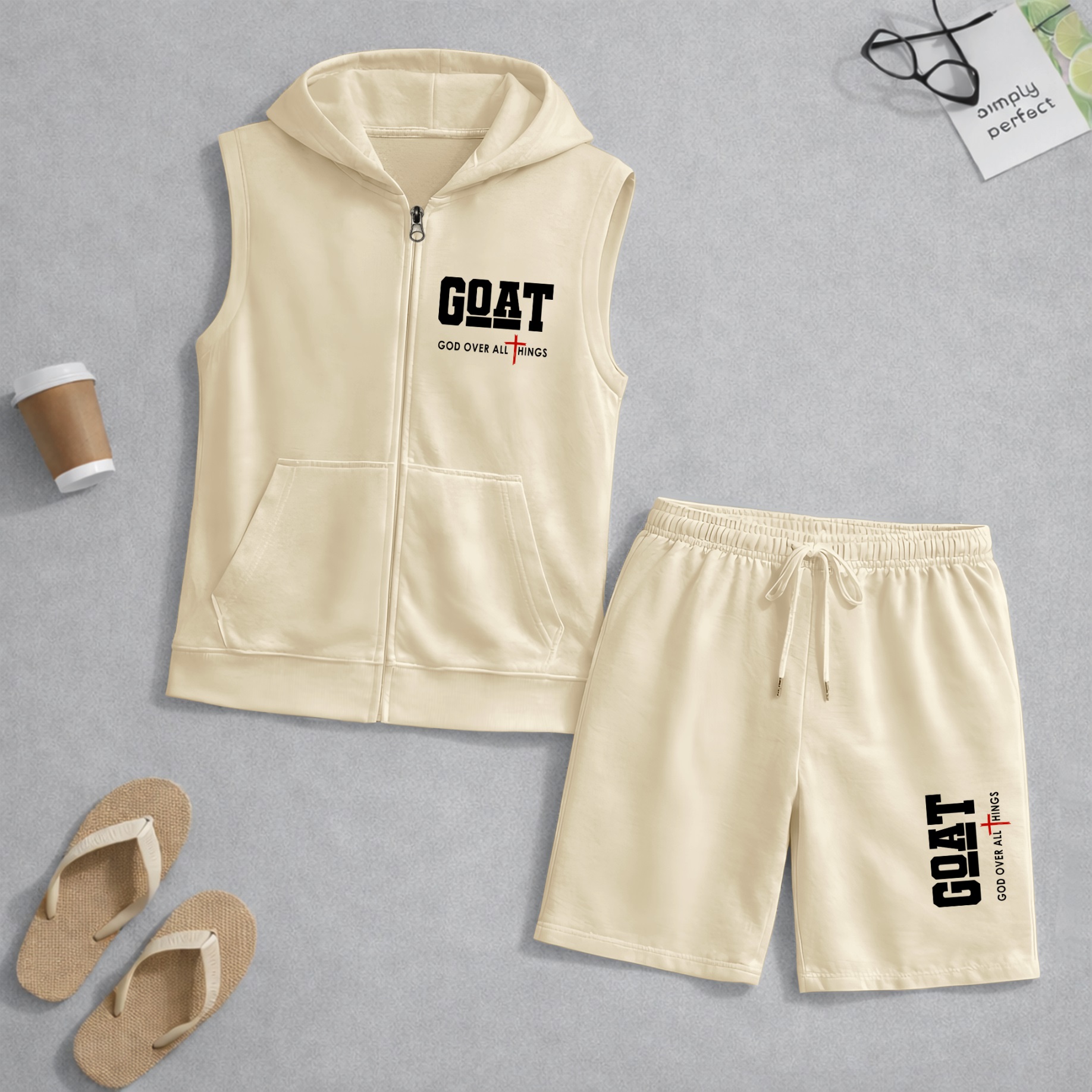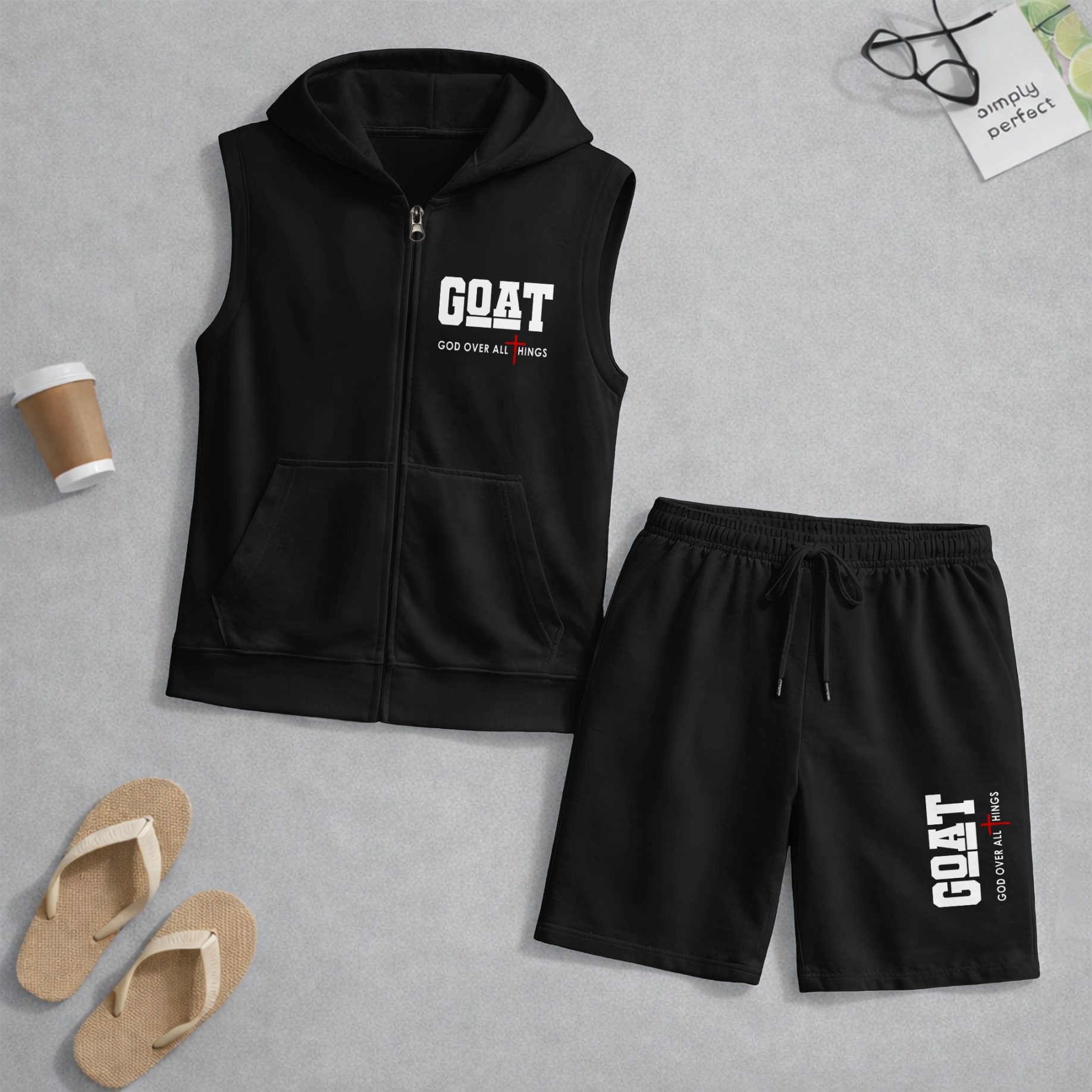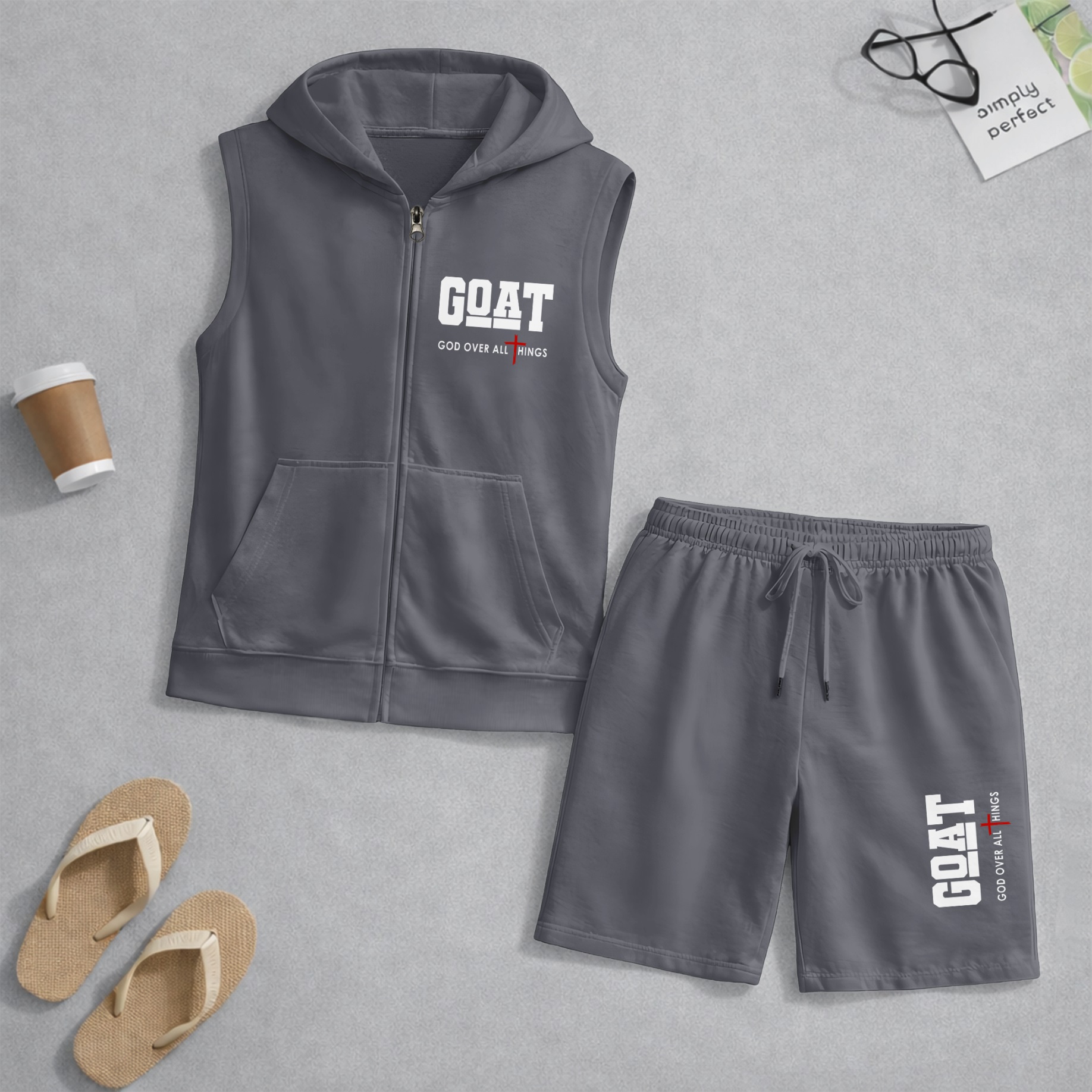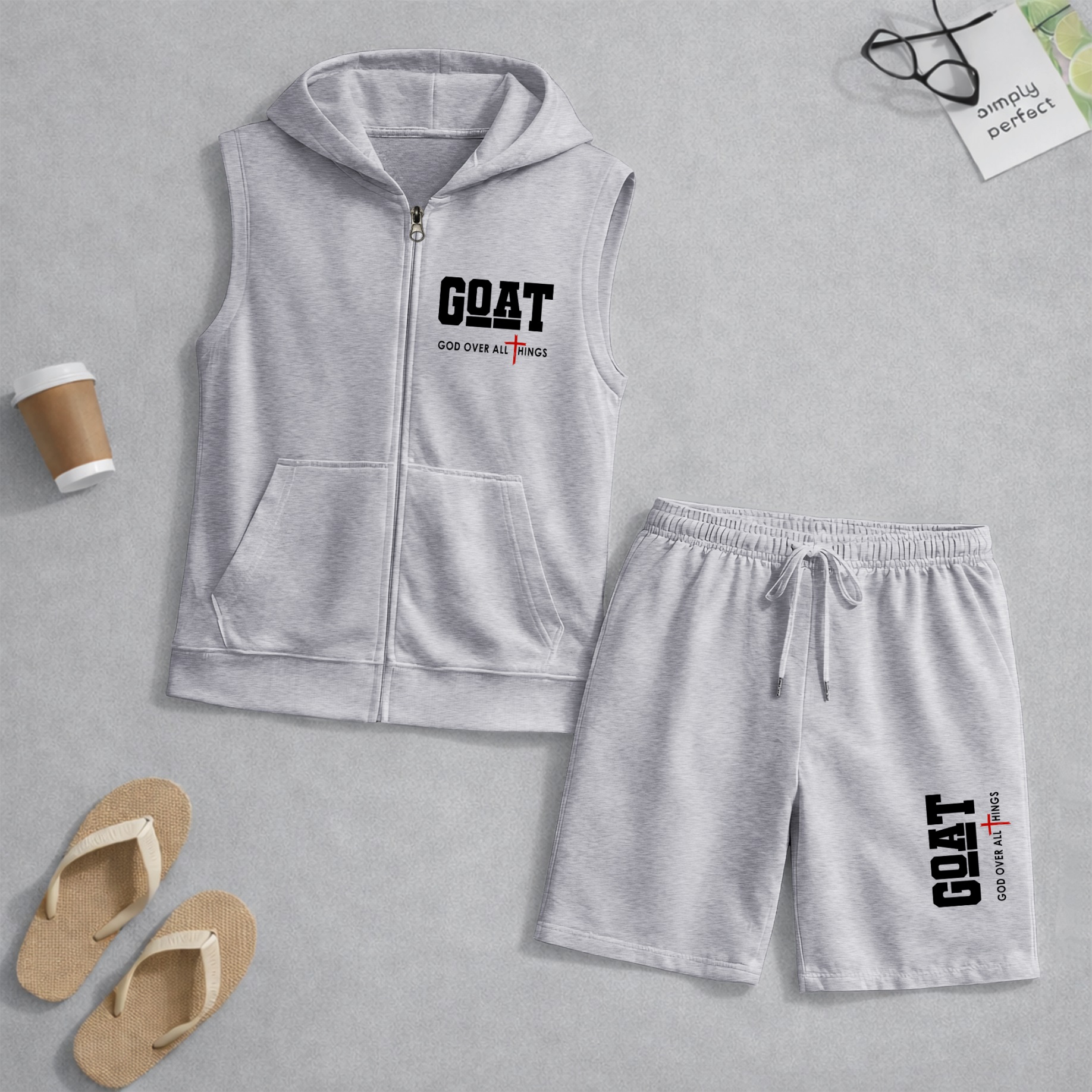 Men's GOAT God Over All Things Graphic Sleeveless Hoodie Shorts Set 2 Piece Outfit Faith Letter Print Zip Up Hooded Vest Drawstring Shorts Summer Casual Gym Workout Streetwear Breathable Lightweight Athletic Lounge Set