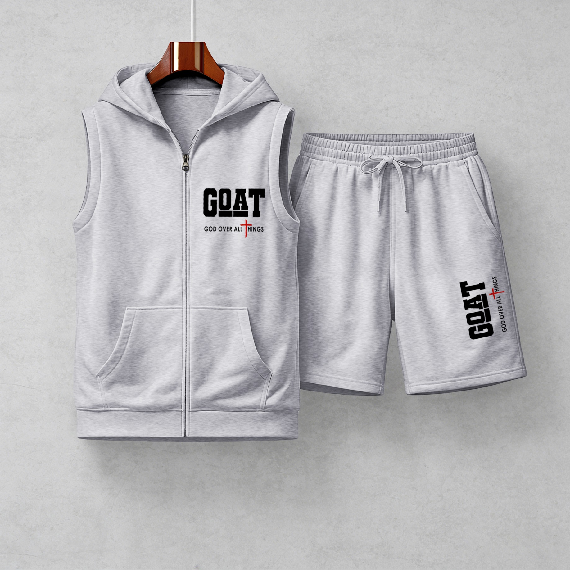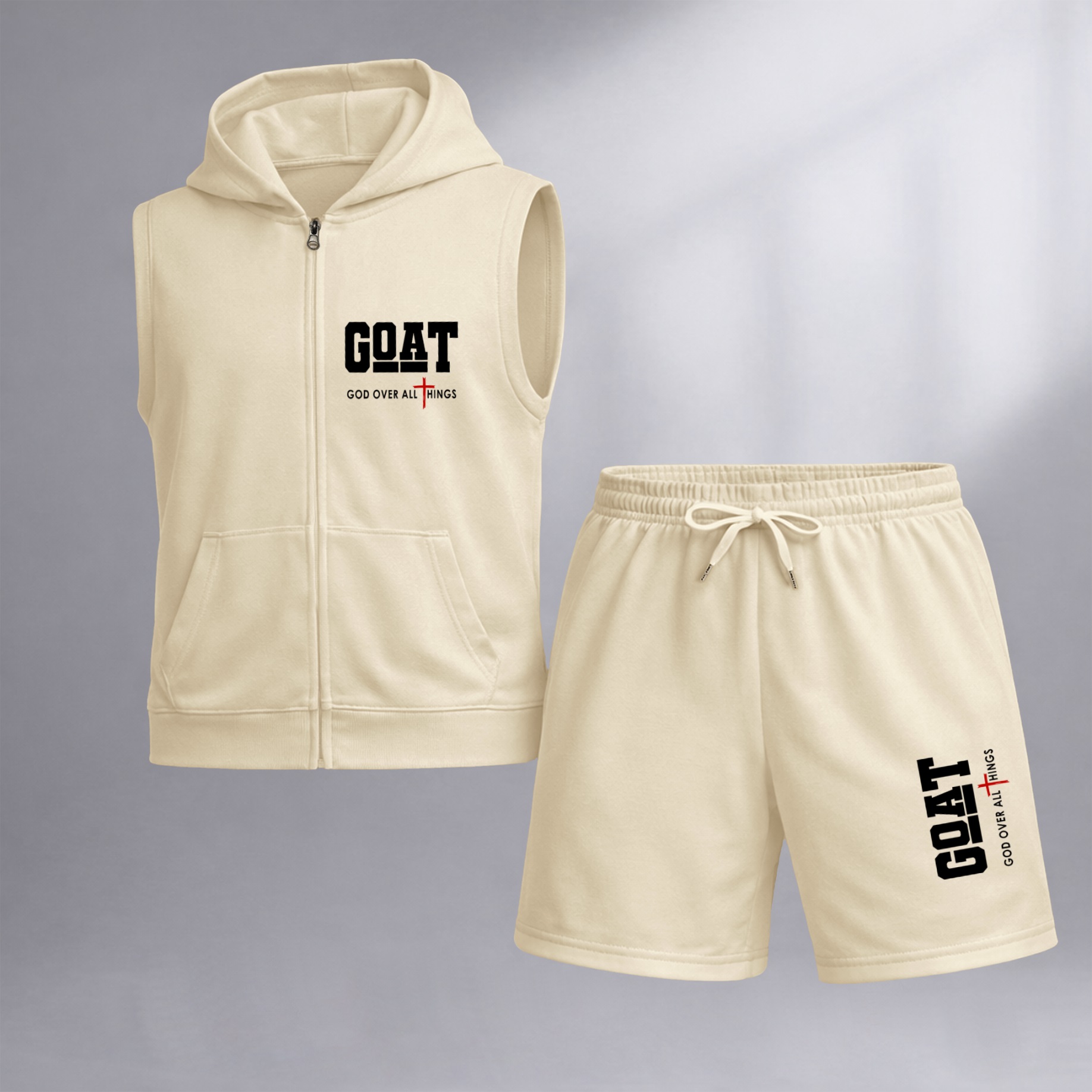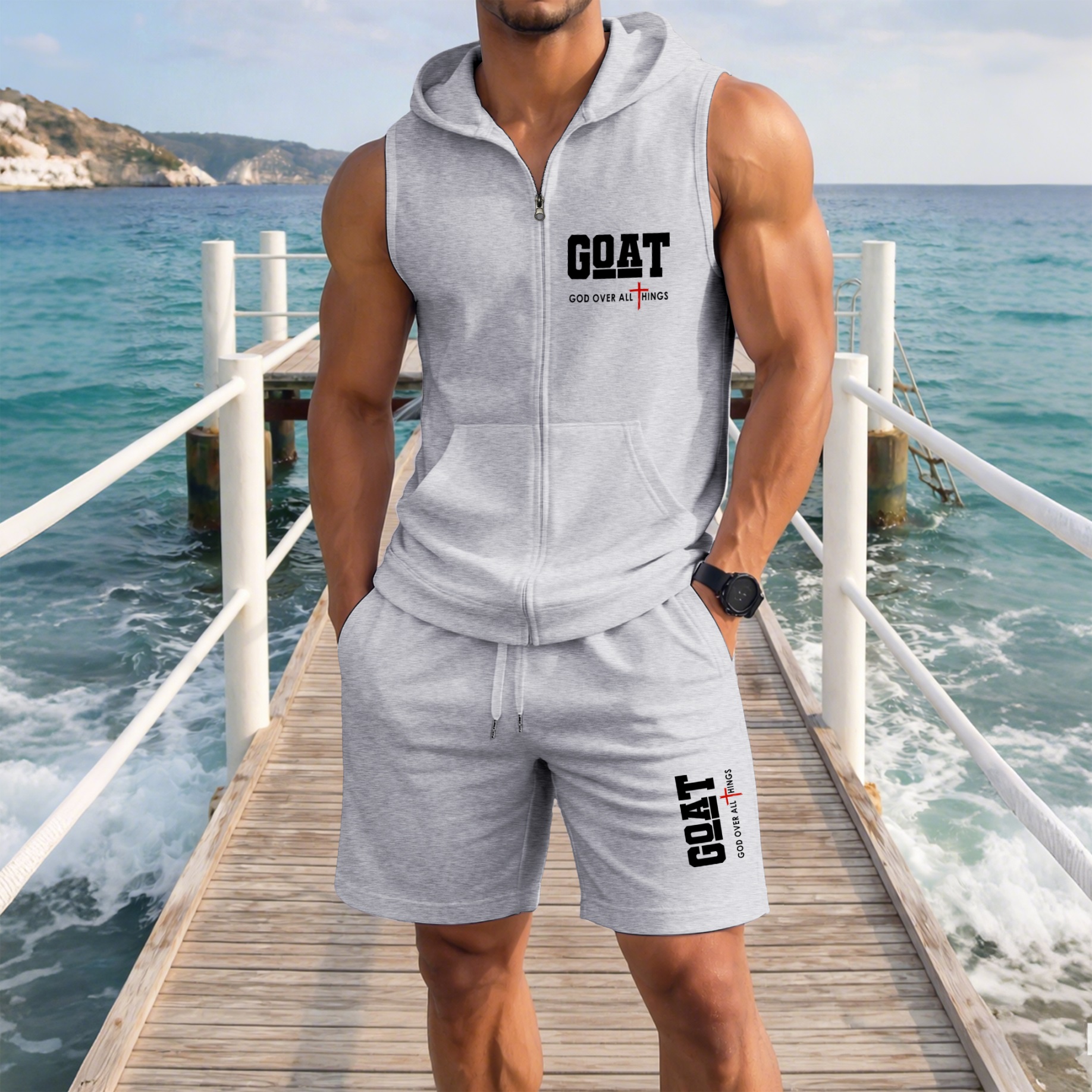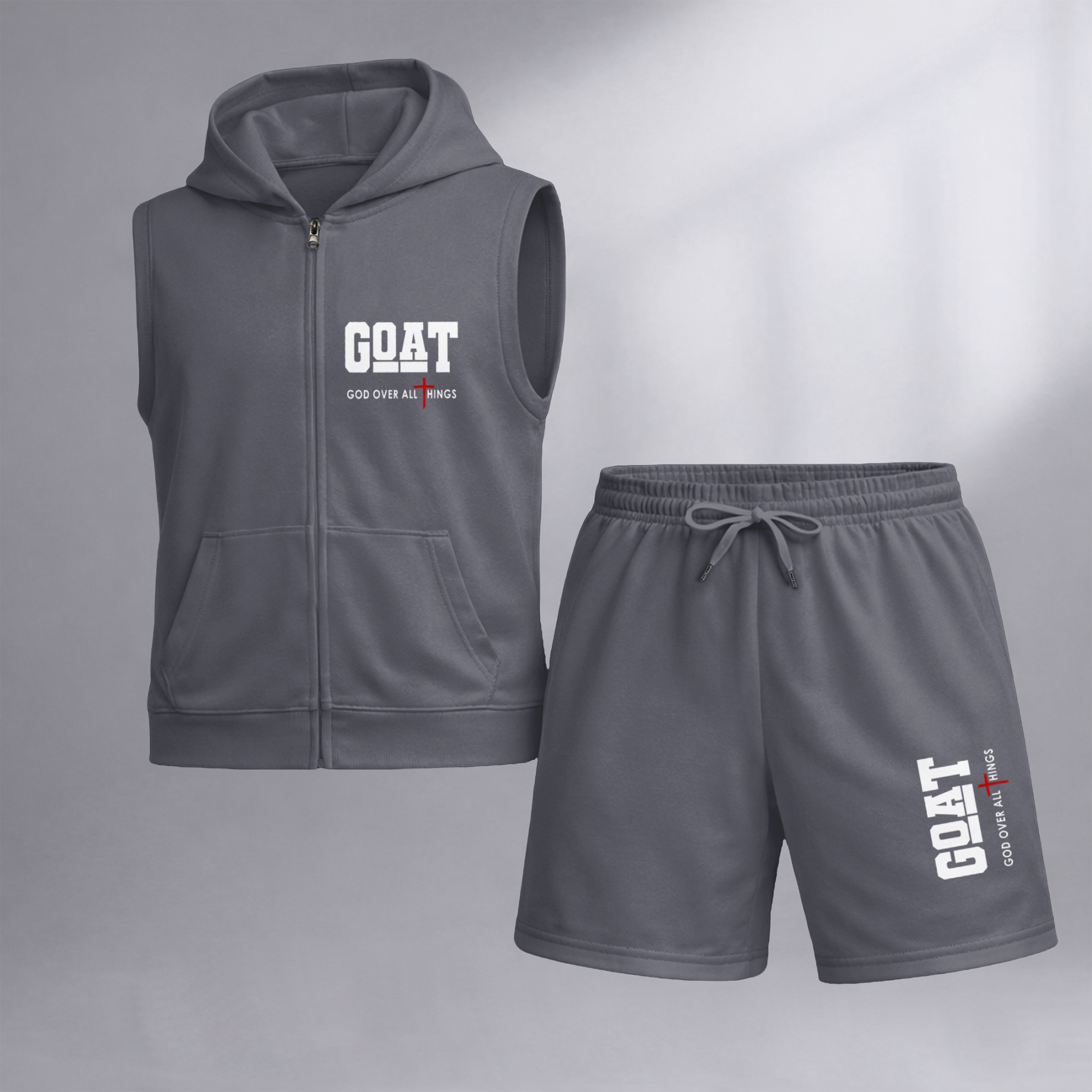 Men's GOAT God Over All Things Graphic Sleeveless Hoodie Shorts Set 2 Piece Outfit Faith Letter Print Zip Up Hooded Vest Drawstring Shorts Summer Casual Gym Workout Streetwear Breathable Lightweight Athletic Lounge Set