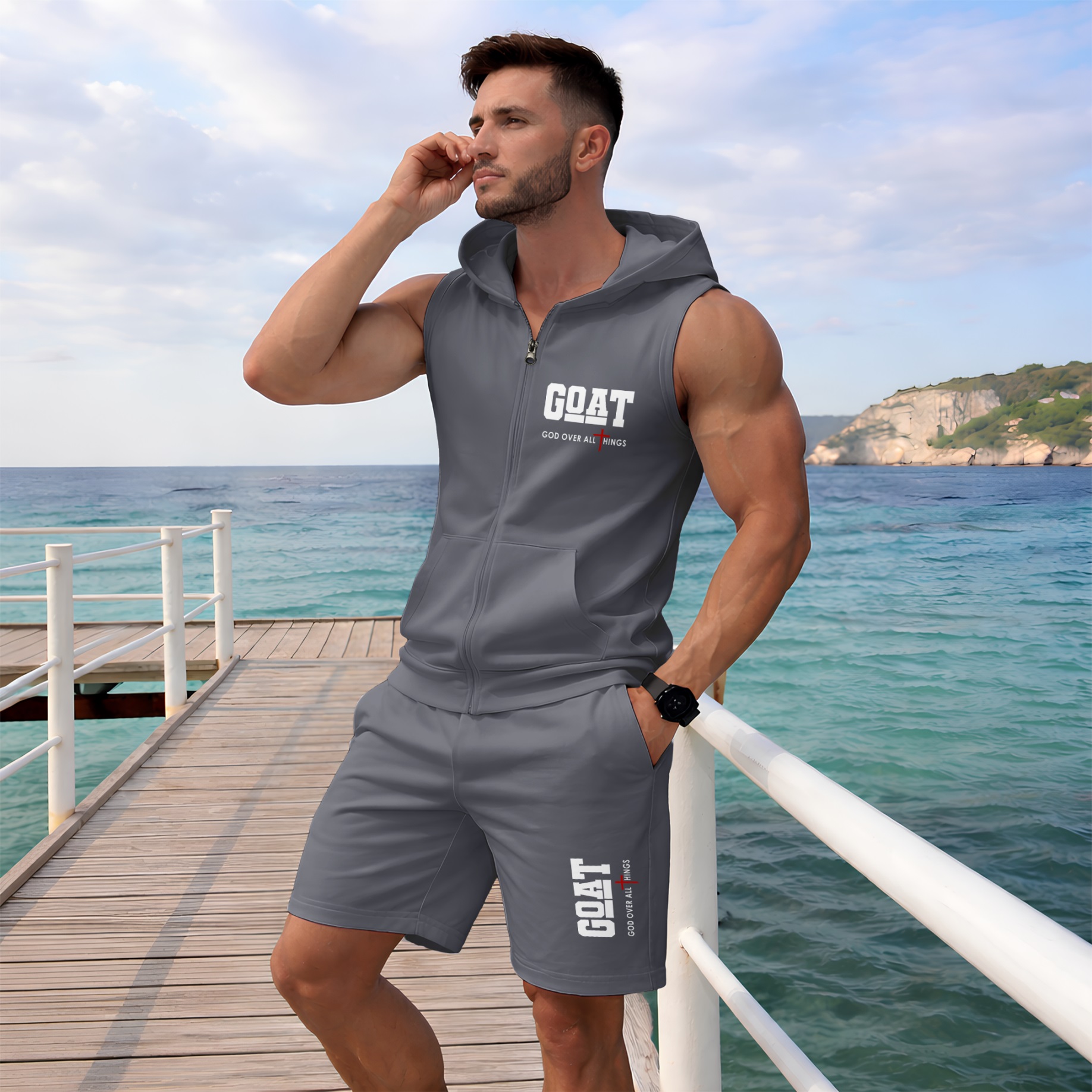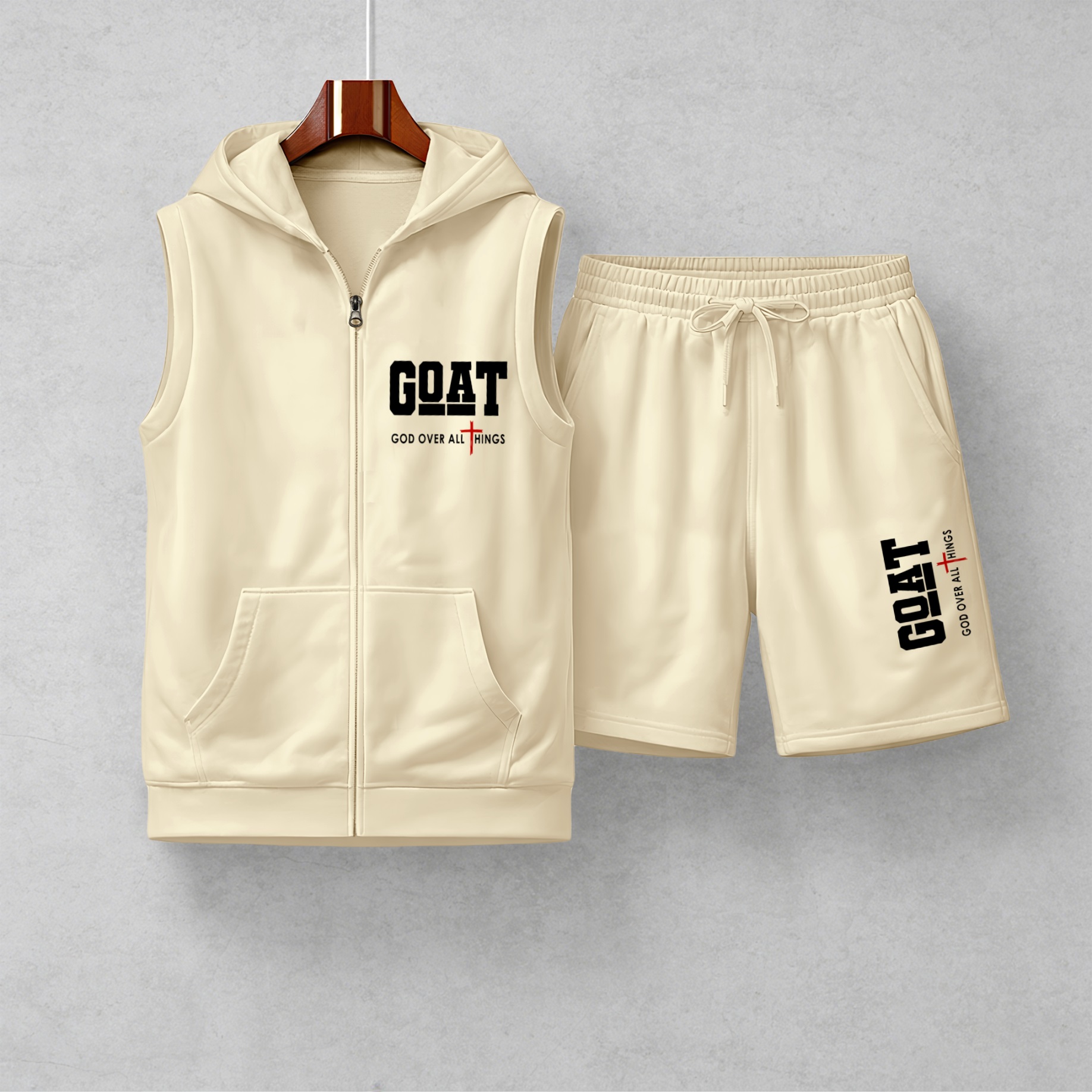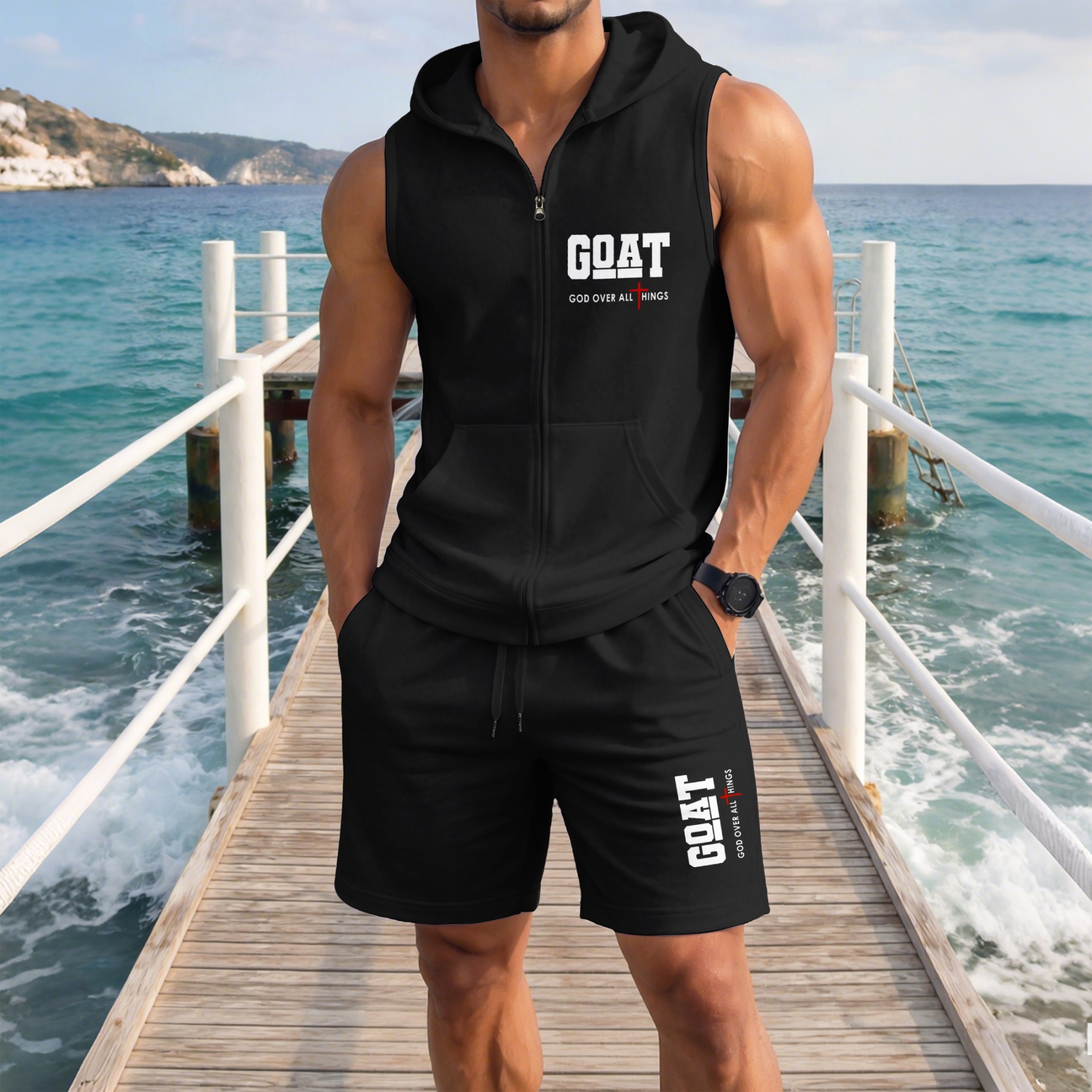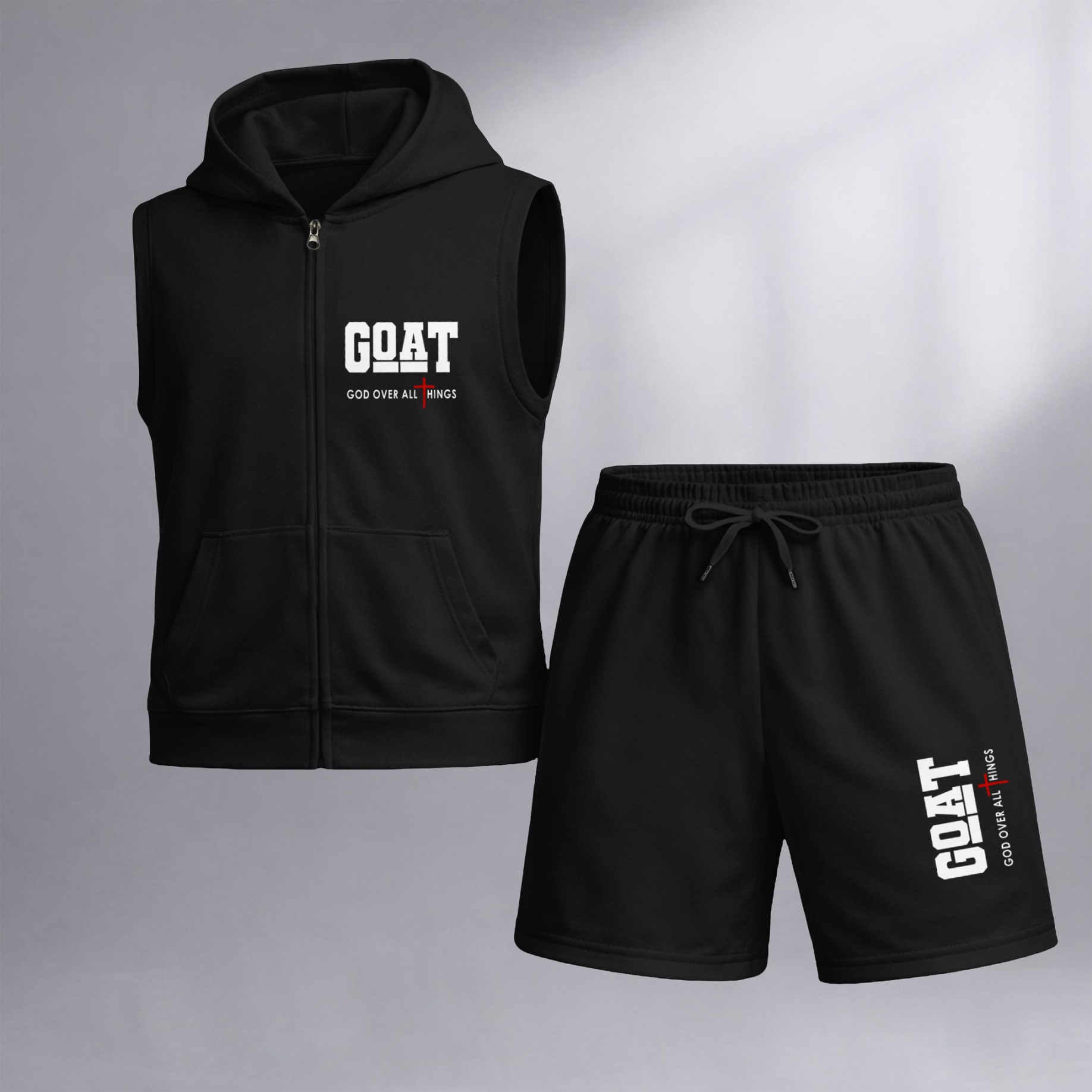 Men's GOAT God Over All Things Graphic Sleeveless Hoodie Shorts Set 2 Piece Outfit Faith Letter Print Zip Up Hooded Vest Drawstring Shorts Summer Casual Gym Workout Streetwear Breathable Lightweight Athletic Lounge Set