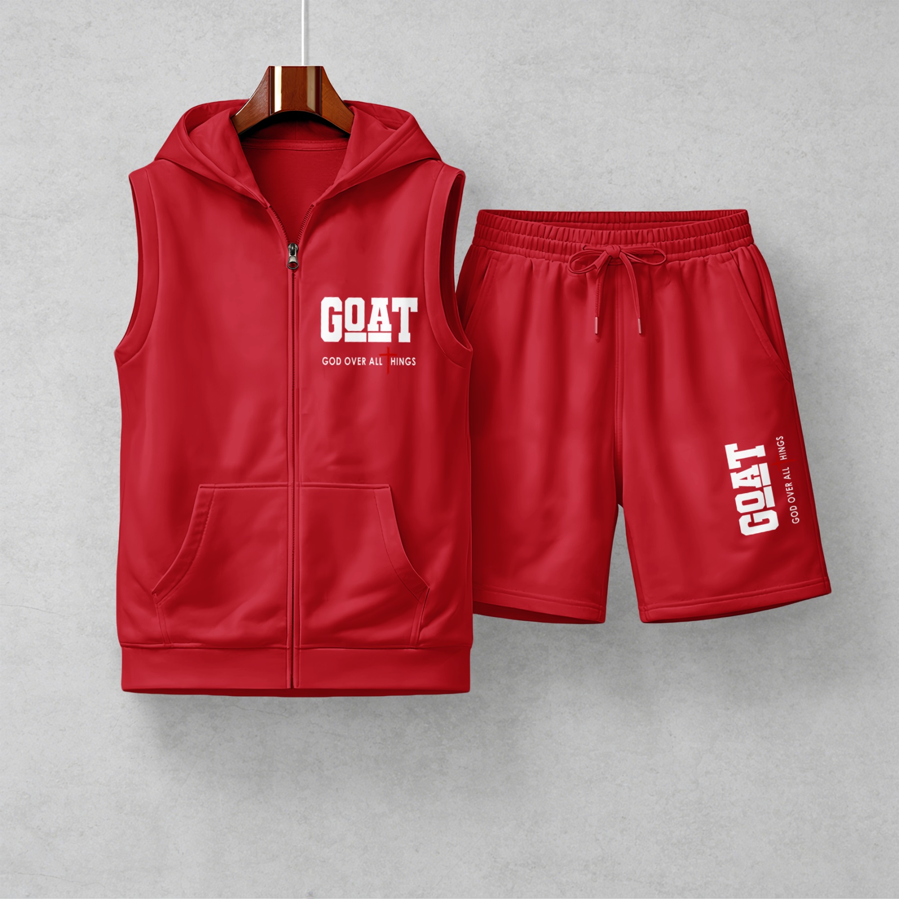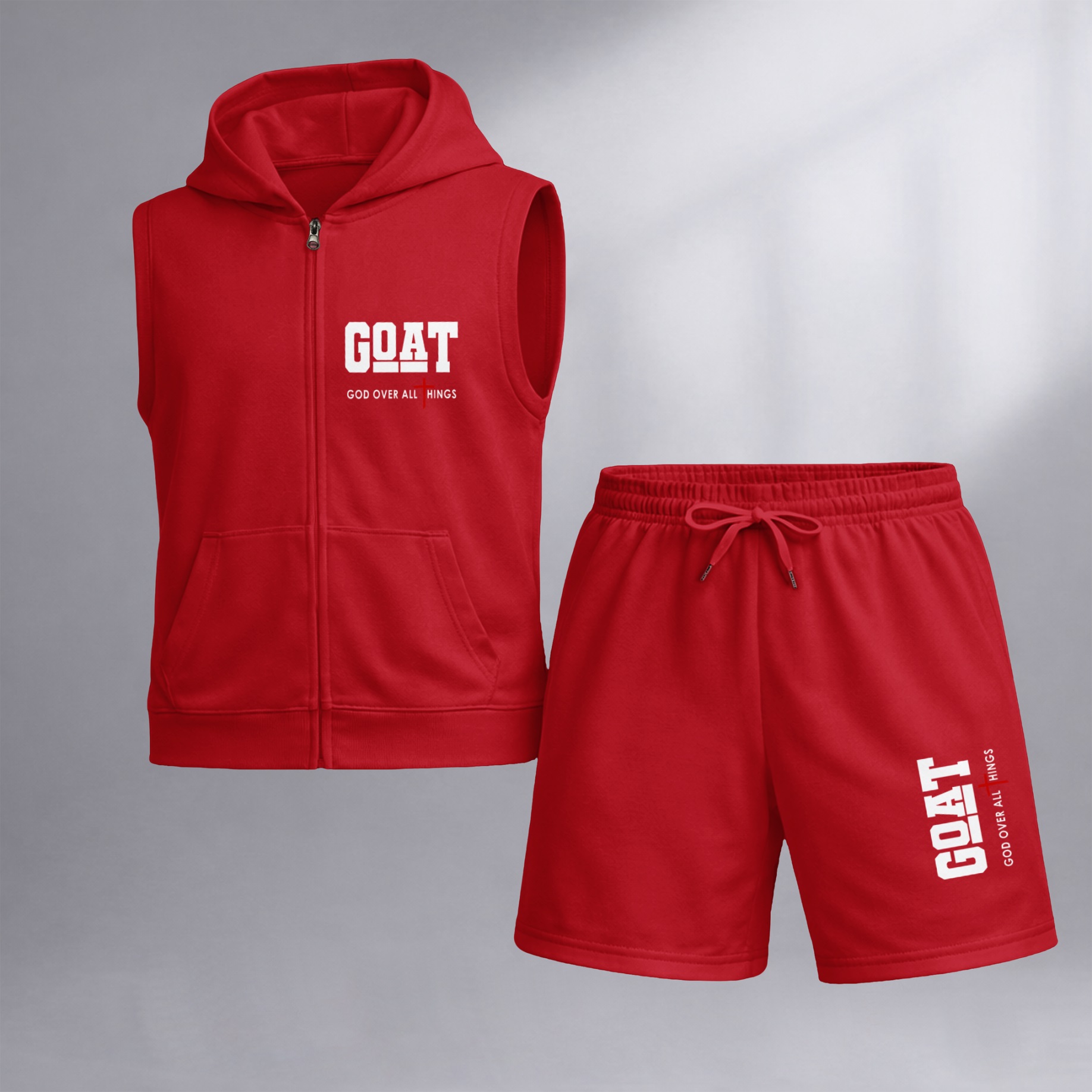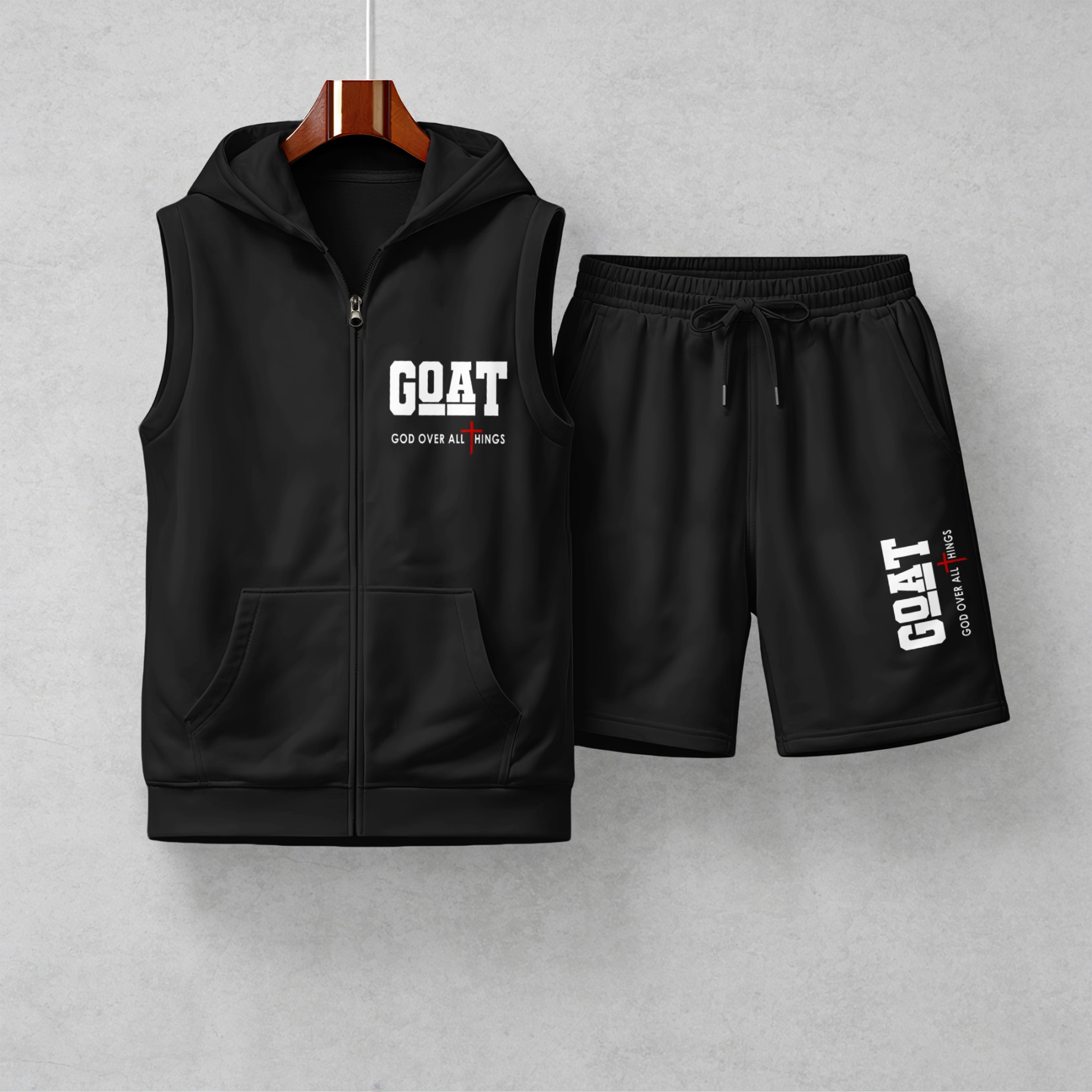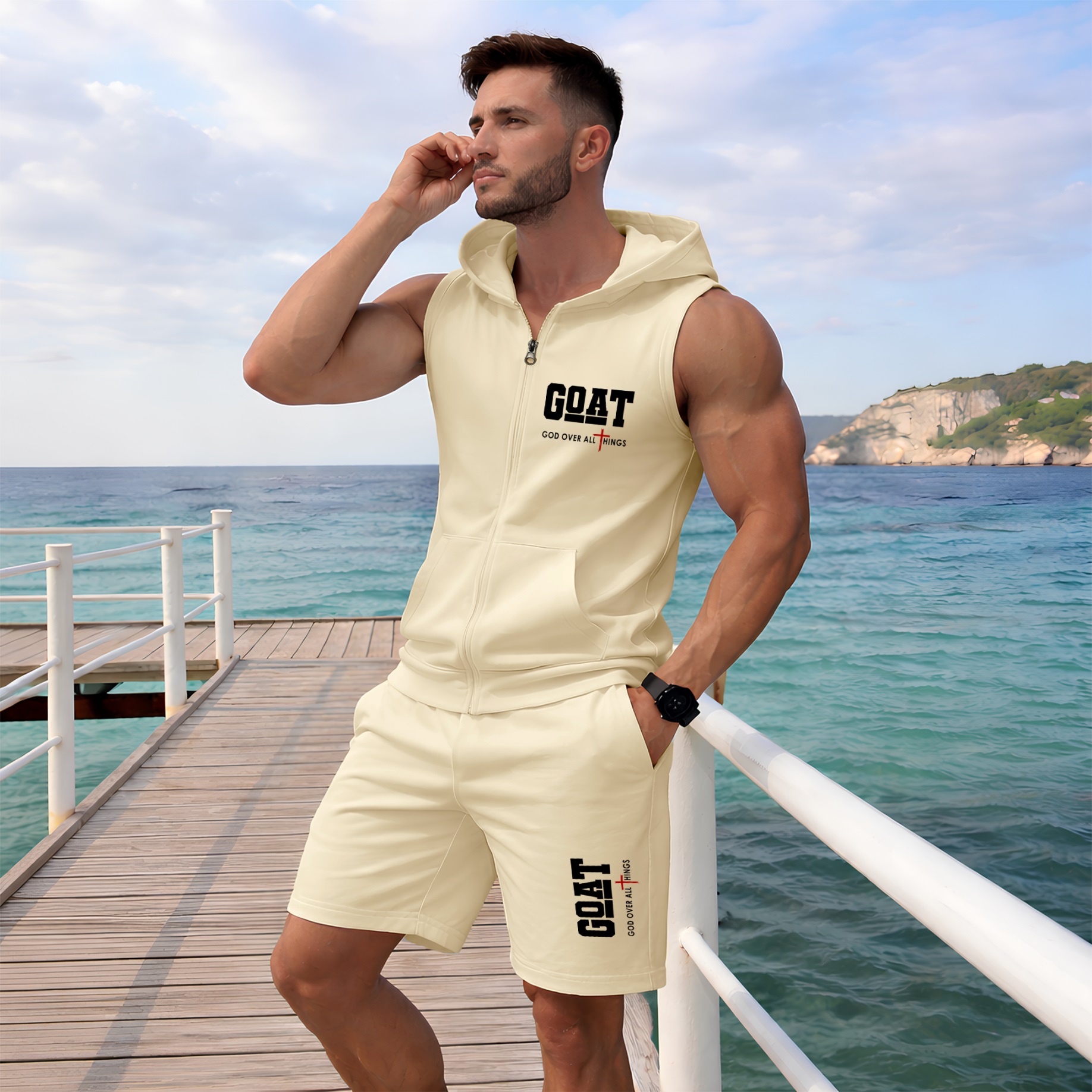 Men's GOAT God Over All Things Graphic Sleeveless Hoodie Shorts Set 2 Piece Outfit Faith Letter Print Zip Up Hooded Vest Drawstring Shorts Summer Casual Gym Workout Streetwear Breathable Lightweight Athletic Lounge Set